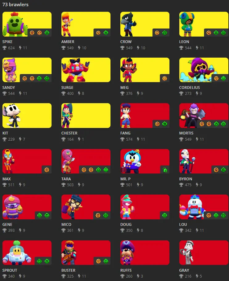 Brawl Stars : 73 Brawlers : 10 Legends : SPIKE ; AMBER ; CROW ; LEON ; SANDY ; SURGE ; MEG ; CORDELIUS ; KIT ; CHESTER