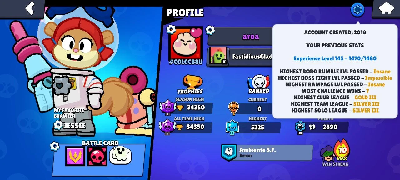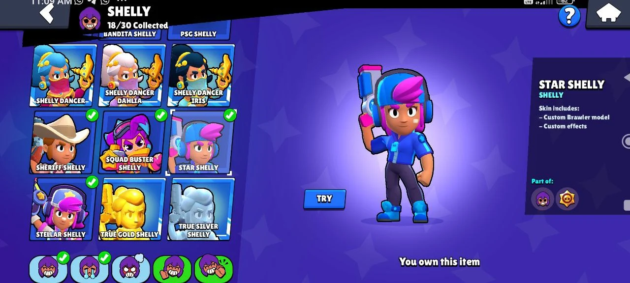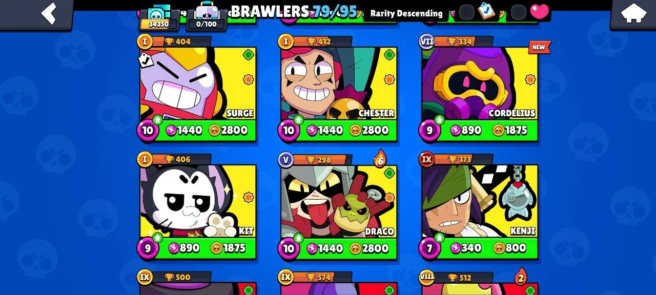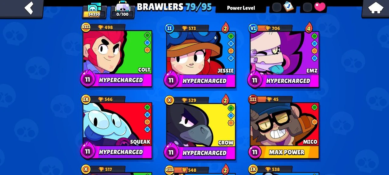 STAR SHELLY 🌟 5 HYPERCHARGED 🔥 6 MAX 💫 34,350 🏆 79/95 BRAWLERS ✨ 12 LEGENDARY 🎯 108 OG SKINS 🎨 MERCHANT GALE 💼 RICOCHET 💫 RED DRAGON JESSIE 🐉 S.B SHELLY 💥