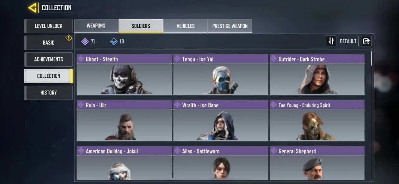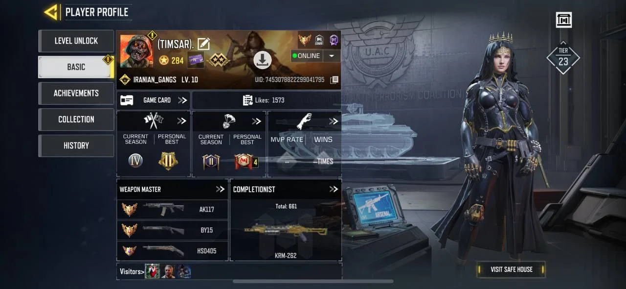 iOS Android 🎯 Level 284 🏆 Rank Grand Master 🫀 157 Epic 💲 7 Legendery ☠️ 1 Mytich 🤯 71 Epic Soldier 🧨Code507