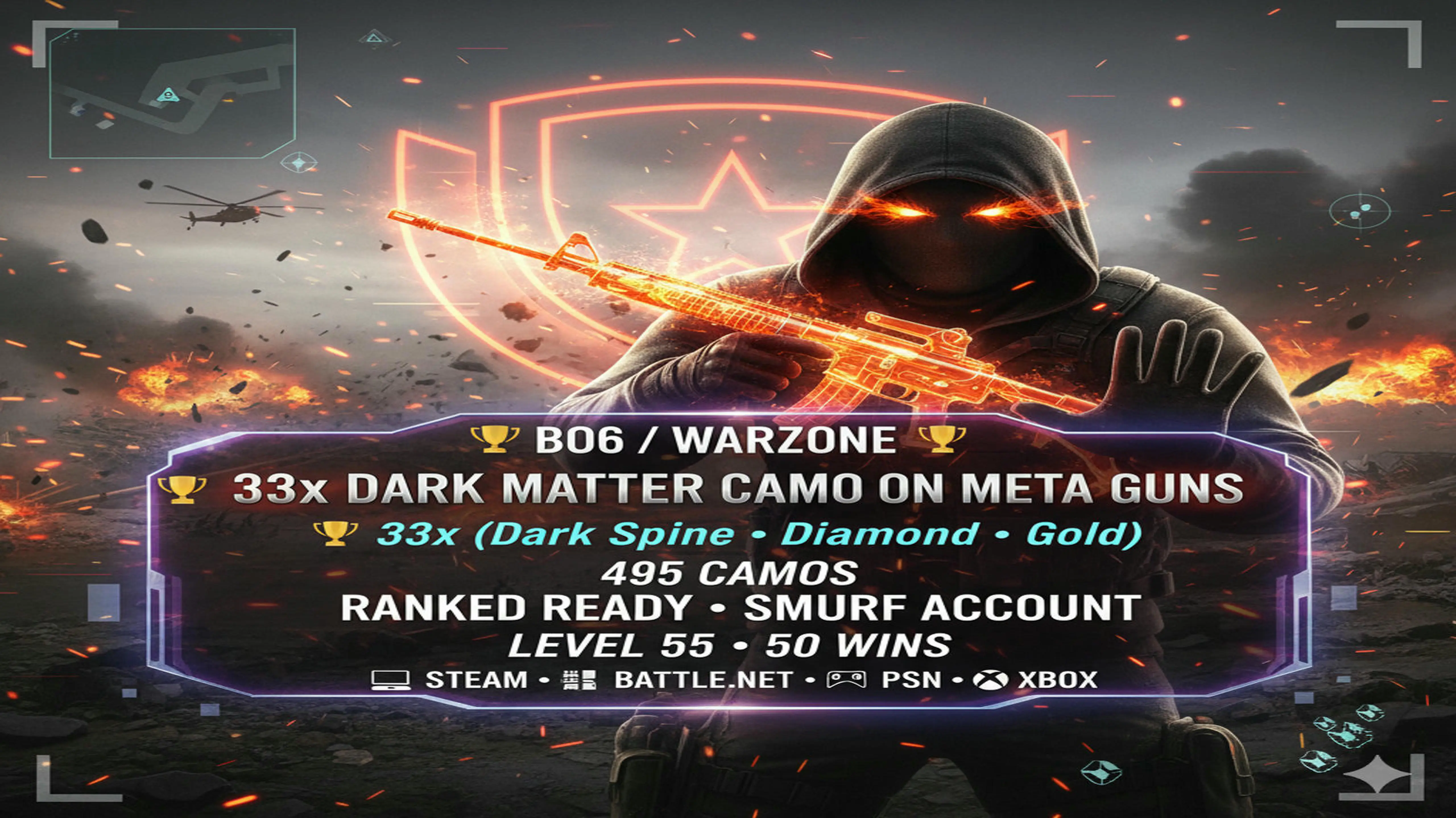 🦊 BO6 / Warzone 🦊 33x Dark Matter Camo on META GUNS 🦊 33x ( Dark Spine , Diamond , Gold ) 🦊 495 Camos 🦊 Ranked Ready 🦊 Level 55 🦊 50 Wins 🌍 Global Queue Enabled 🦊 Steam , Battle Net , PSN , XBOX #7QWSfH