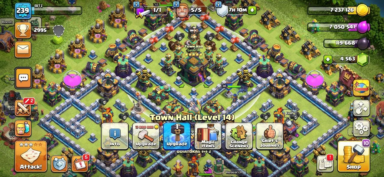 2500 CWL MEDALS 🏅 239 XP 💎 5 STAR FULL MAX DEFENSE TH14 🌟 HEROES 72-73-52-55-30 🔥 4500 GEMS 💎 MAGIC ITEMS & 4.3K RAID MEDALS STACKED ✨️ HIGH LVL EQUIPMENTS 😈 RENAME AVAILABLE ✅️ CHEAPEST 💥 INSTANT DELIVERY🚚