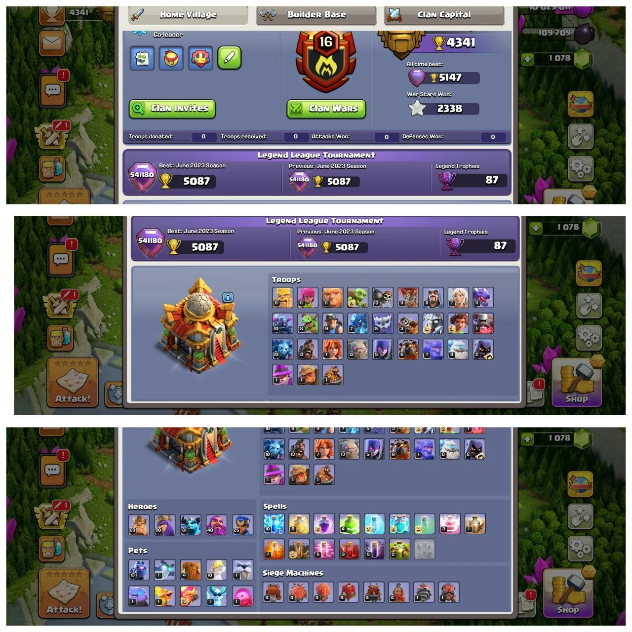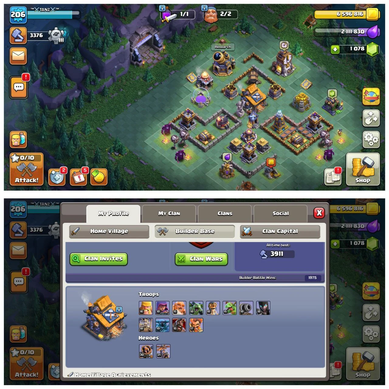 All Wall 100% Max♦️Th16 Max♦️Heros [69-90-61-40-25]♦️Defance+Profile Max ♦️XP-206 With 6 Builder♦️All Heros Skins ♦️High BH【29】