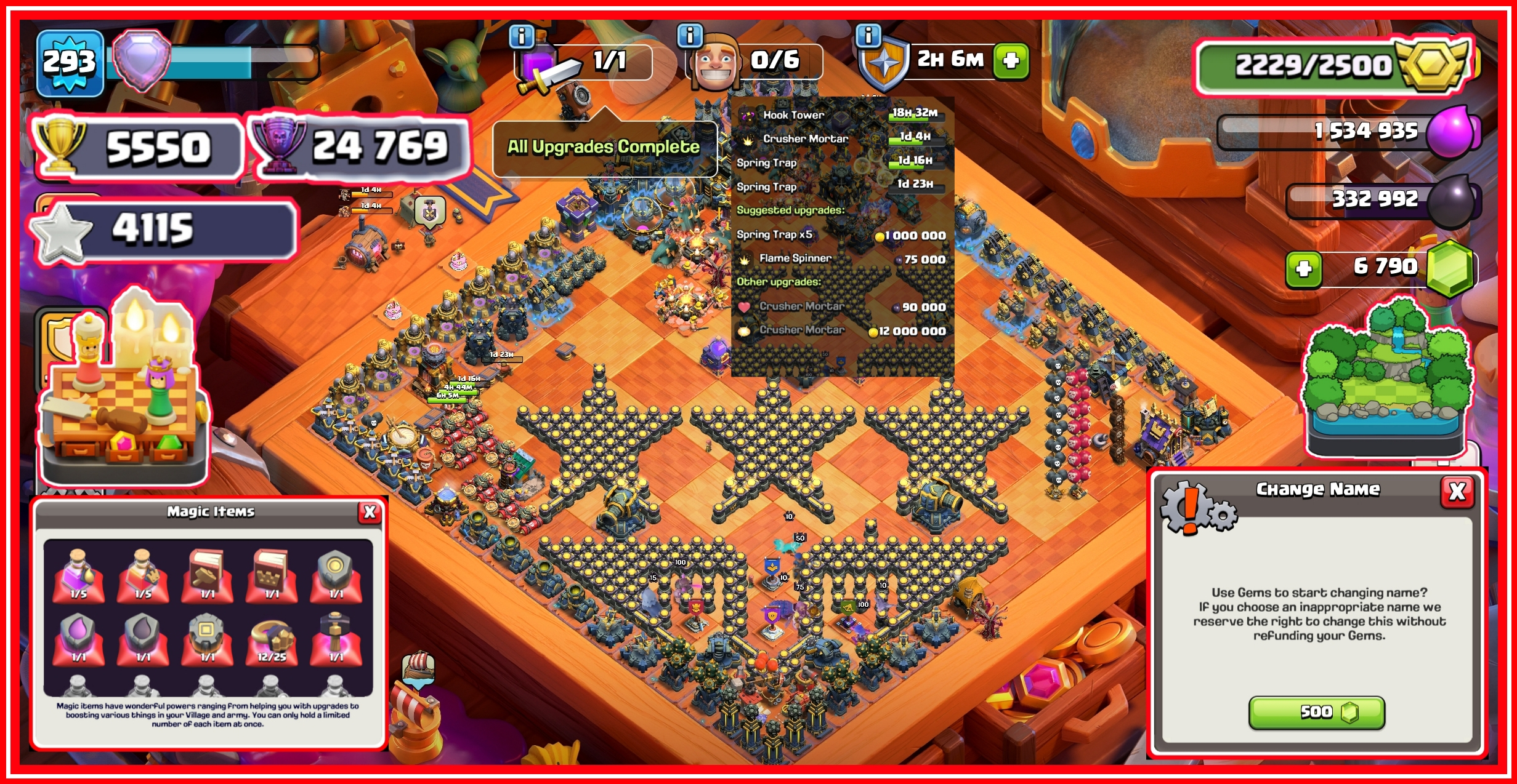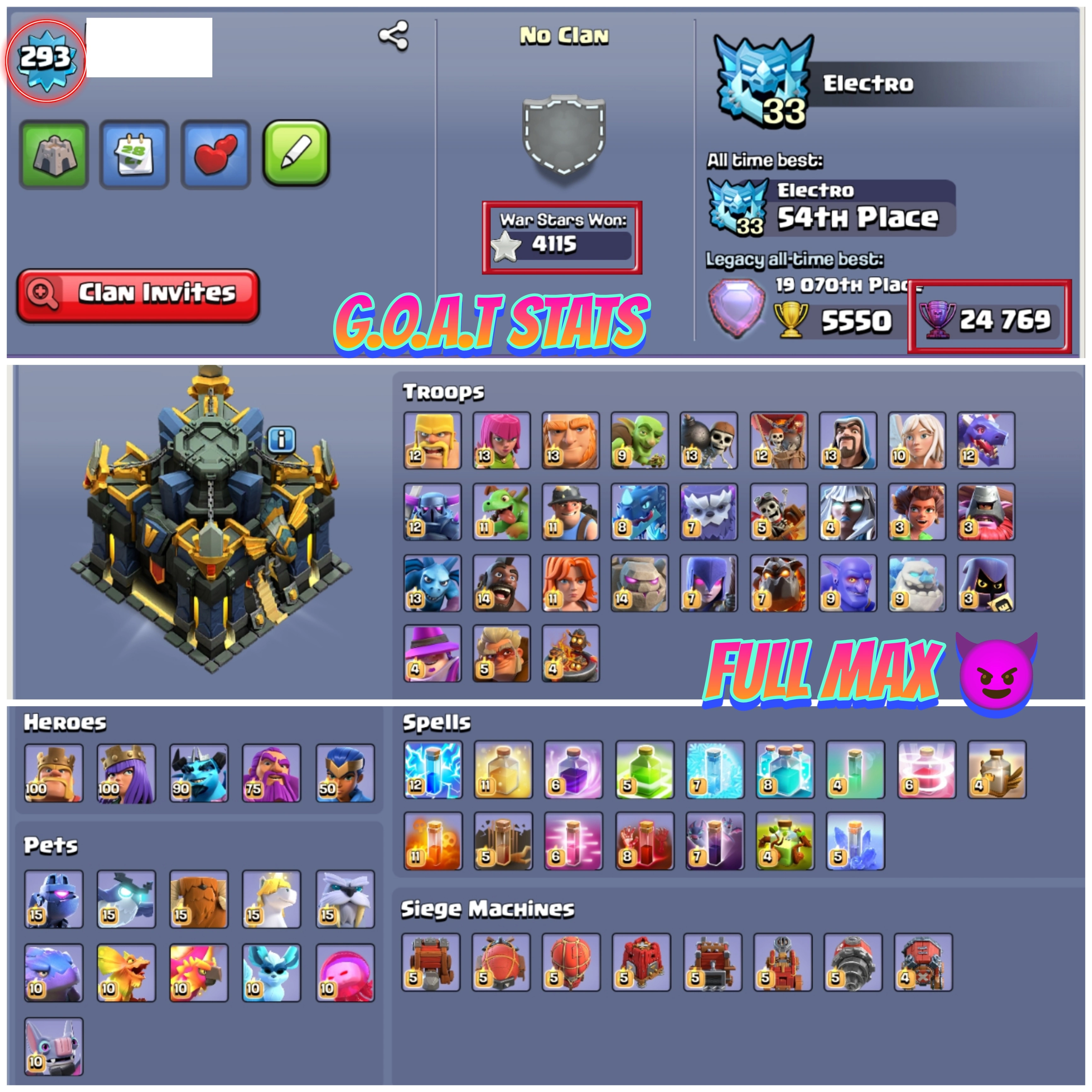 π TH 17 Full Maxed Out βοΈ 6700+ Gems β’ Rare 293 XP π 24K Legend Cups β’ 2200+ CWL Medals π₯ Rare All 13 Epic Equipments β’ 24 Max Equipments π Instant Delivery