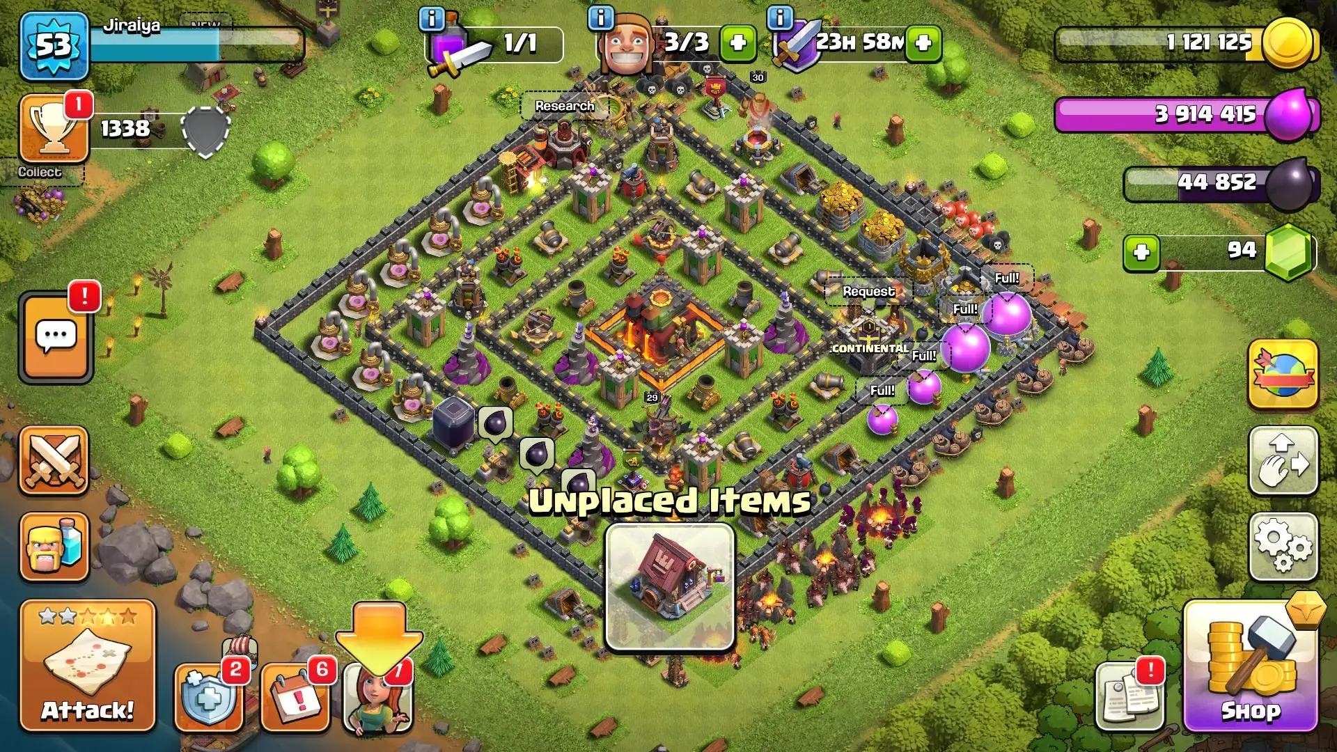 TH10 | 53 LVL | 1338 Trophy | 94 GEMS | 30BK | 29AQ | 0GW| 0RC | FULL ACCESS | IOS/ANDROID (SCREENSHOTS INSIDE)