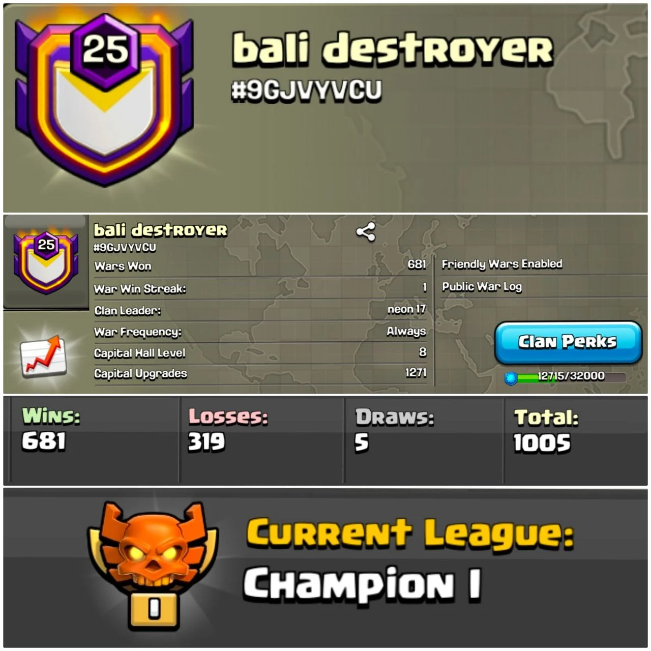 Champion League 1 | Clan Capital 8 | Level 25 | Name- Bali Destroyer | Awesome Warlog | Fast Delivery
