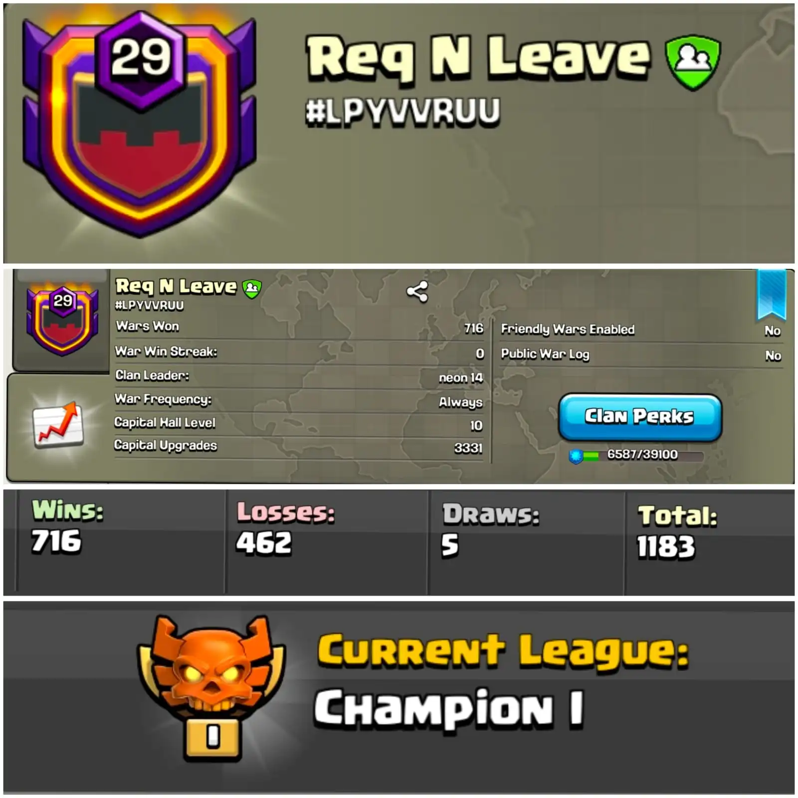 Champion League 1 | level 29 | Name- Req n Leave | Clan Capital 10 | Positive Warlog | Fast Delivery
