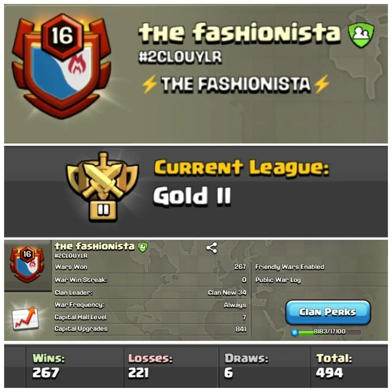 Level 16 clan || clan capital 9 || gold 1 ||warlog 123-119 || name - Req & Go