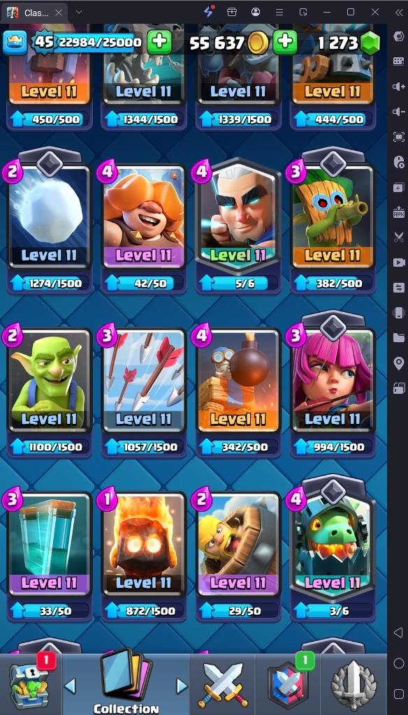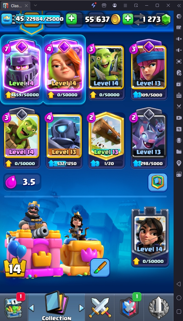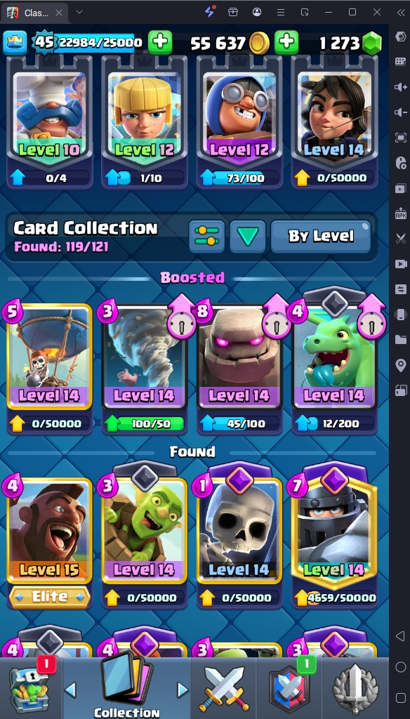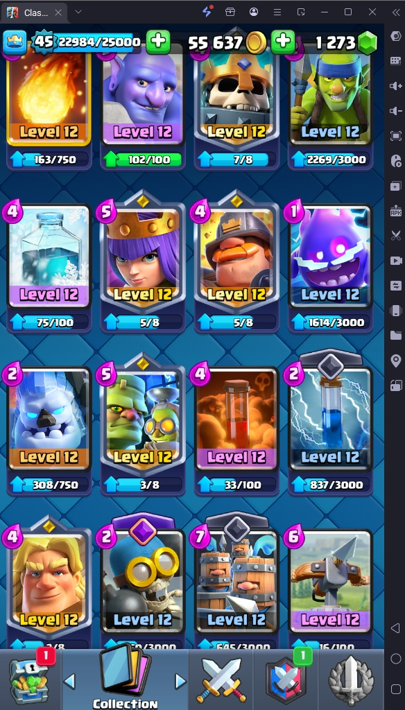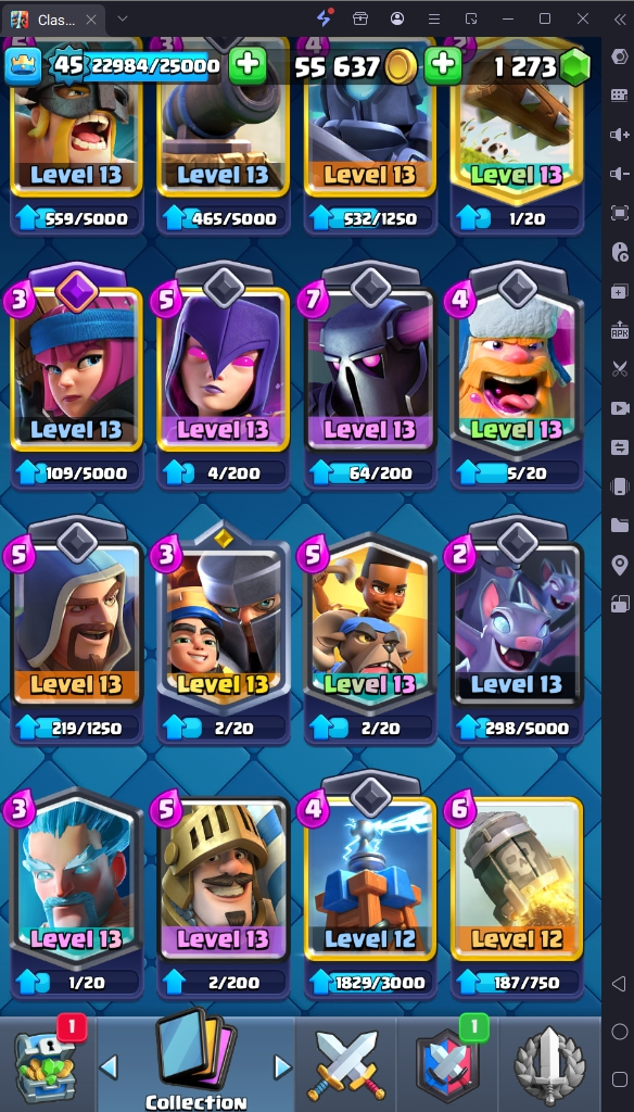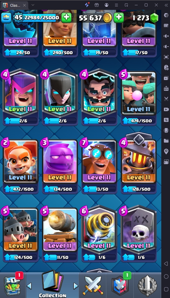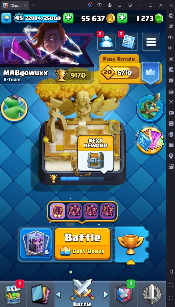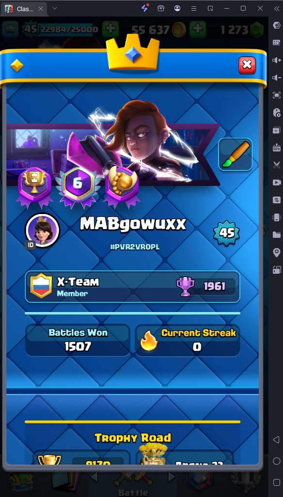 9170 TROPHY 🏆 45 LVL 💯 KT 14 👑 119 CARDS ♦️ 7 MAX CARDS 👑 1 ELITE CARDS 🔮 7 EVO 💯 EMOTE 44 🎭 #PVR2VR0PL ⸱ TAG ACCOUNT ♥️
