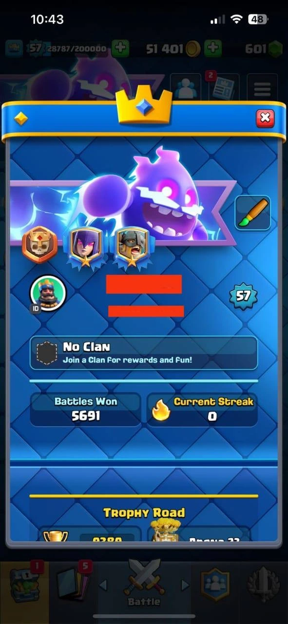 9389 Trophies | XP Lvl 57❗️| 41 MAXED CARDS❗️| 12 ELITE LEVEL CARD ❤️🔥| 13 EVOLUTIONS📈 | 76 EMOTES | 100% safe account | instant delivery