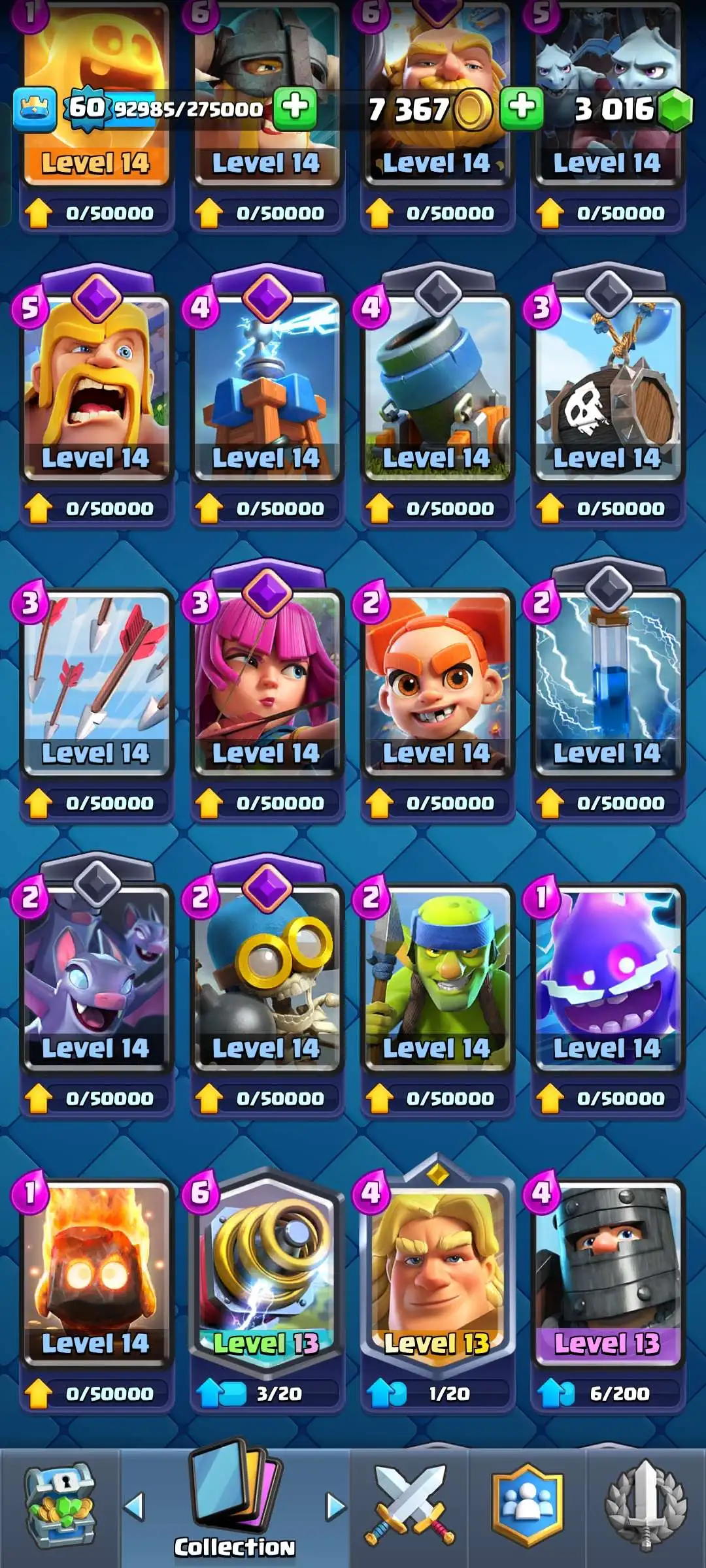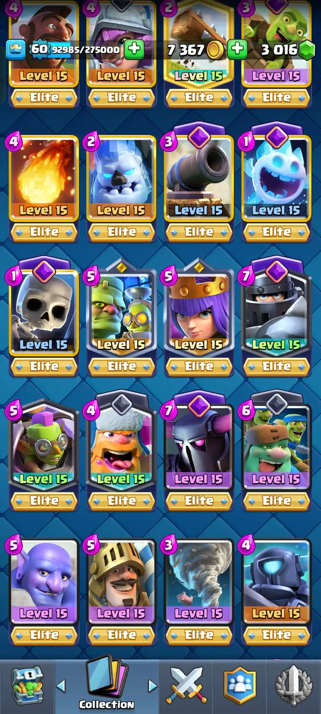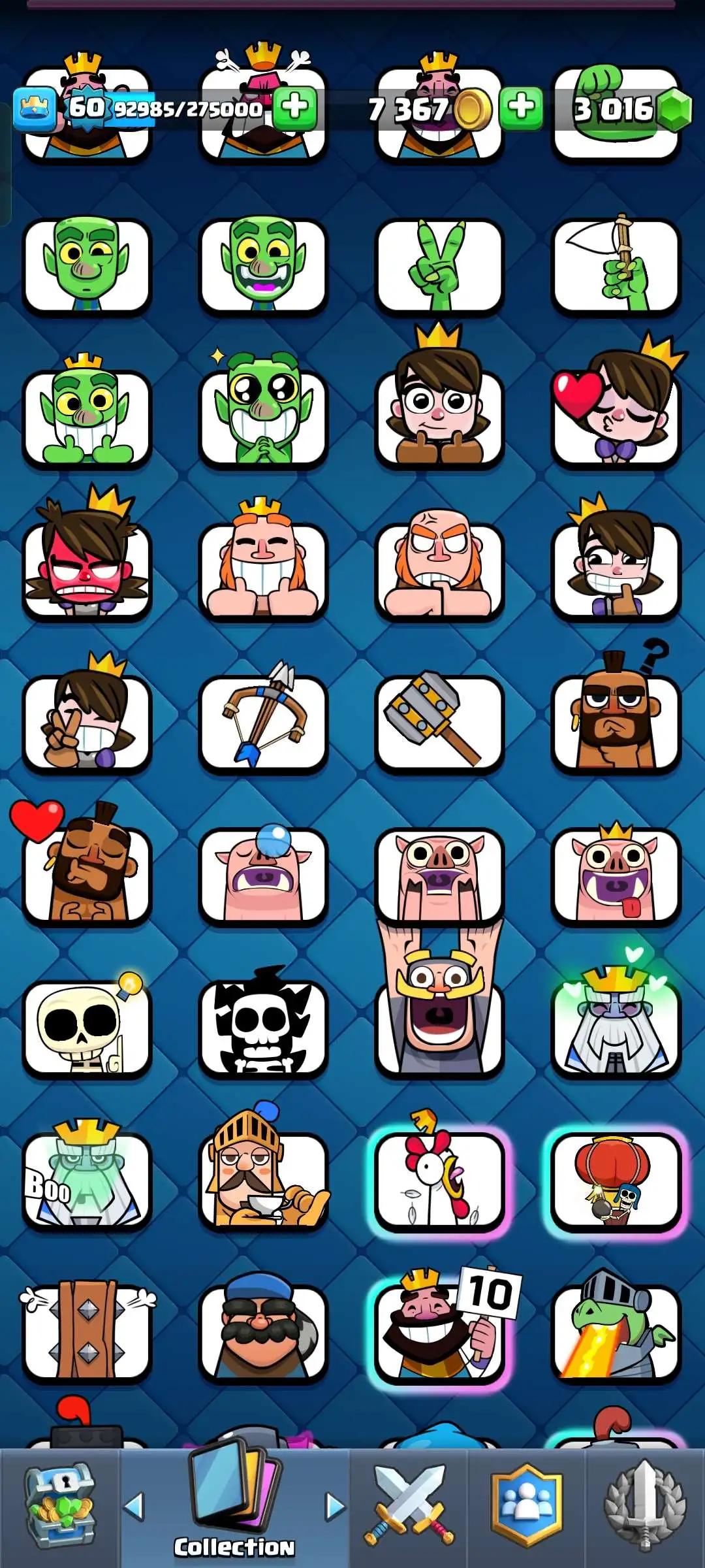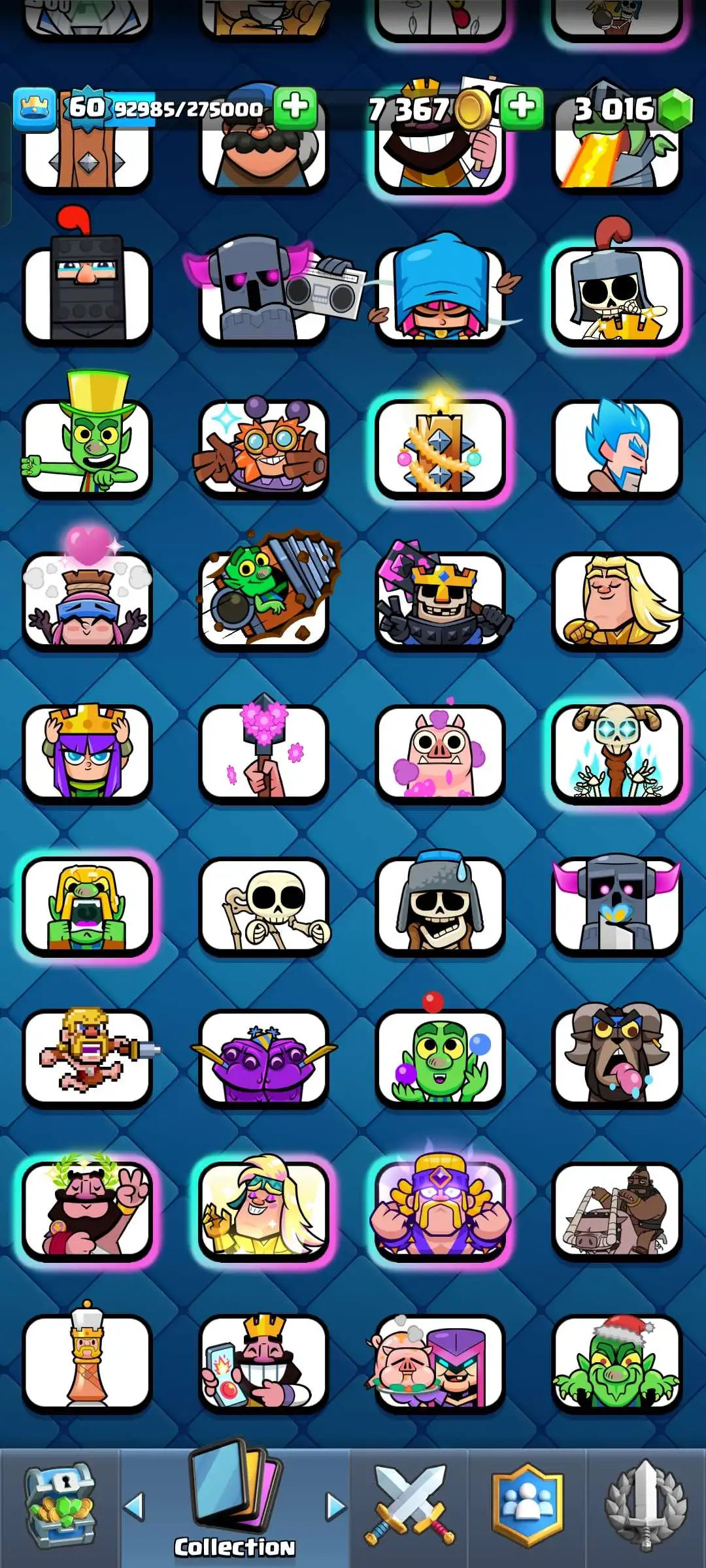 CR Lvl 60 ✨ 12750 Trophy ✨ KT 15 ✨ 24 Elite Cards ✨ 82 max cards ✨ 17 Evo Cards ✨ 122 Emotes ✨ 9 Tower skins