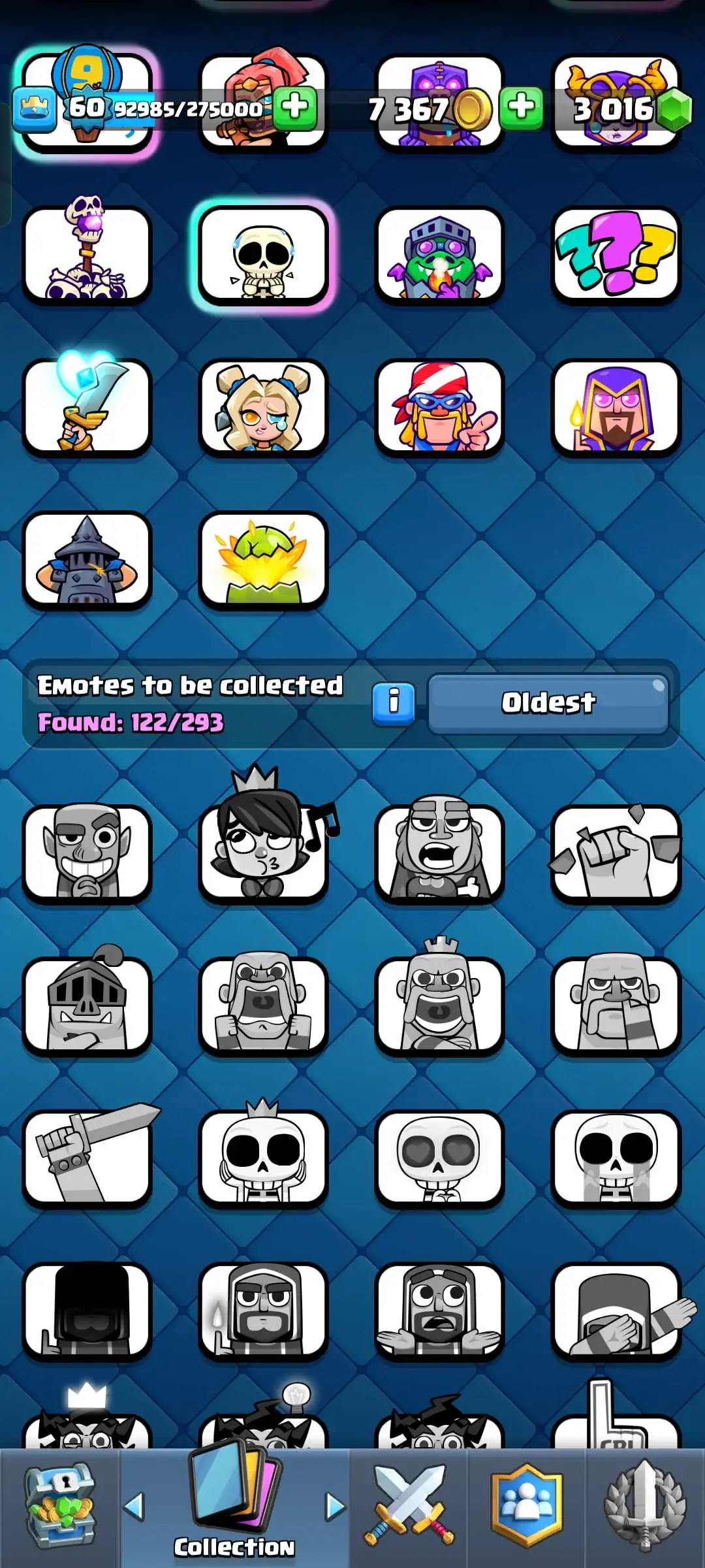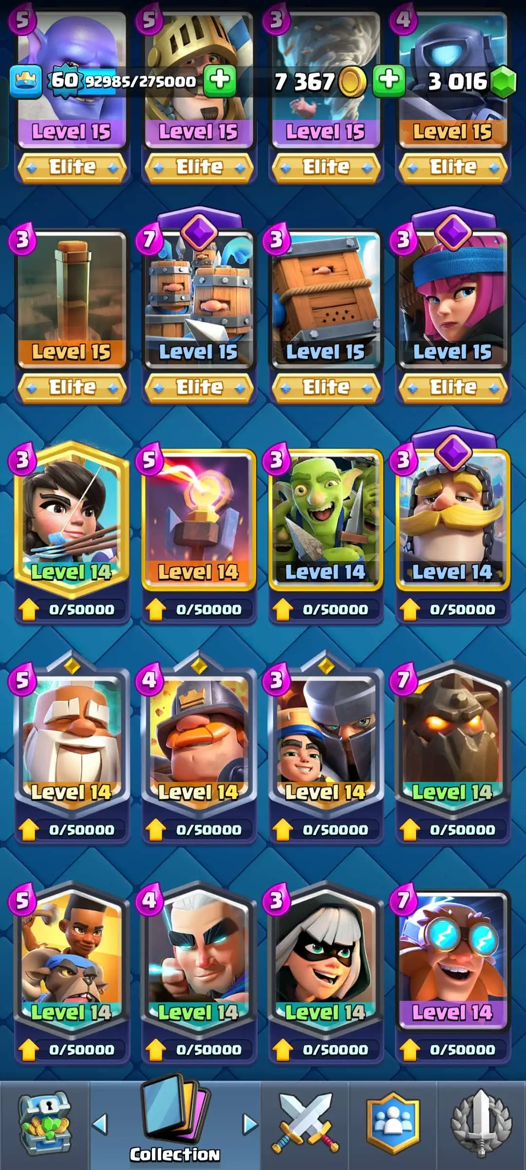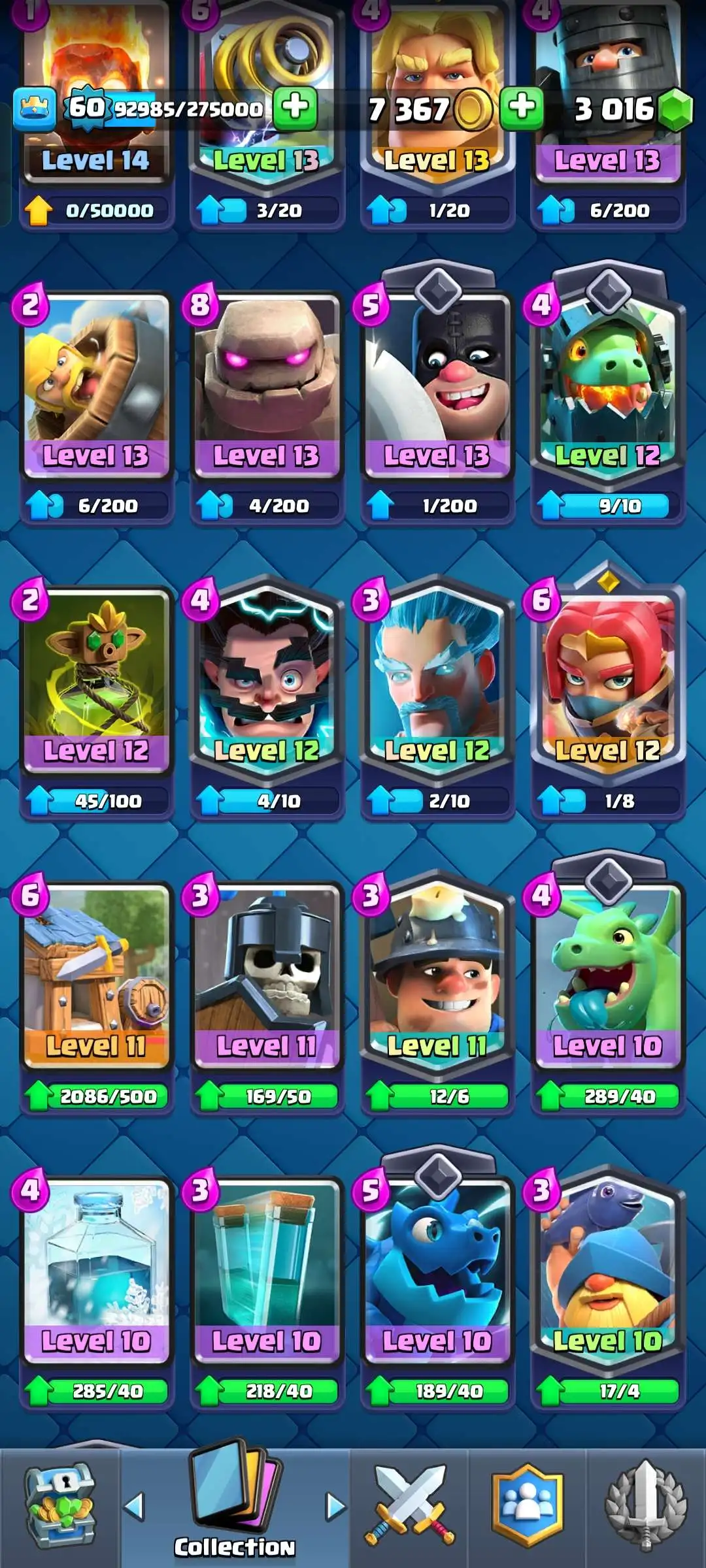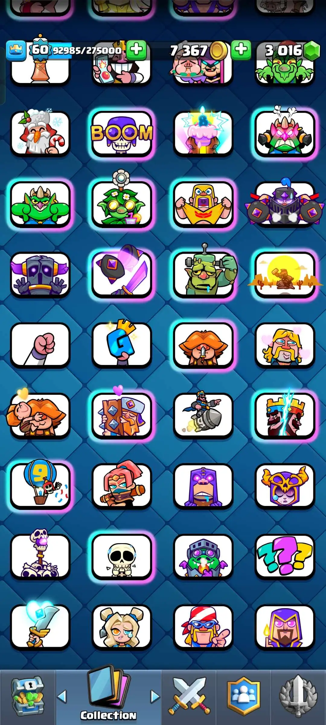 CR Lvl 60 ✨ 12750 Trophy ✨ KT 15 ✨ 24 Elite Cards ✨ 82 max cards ✨ 17 Evo Cards ✨ 122 Emotes ✨ 9 Tower skins