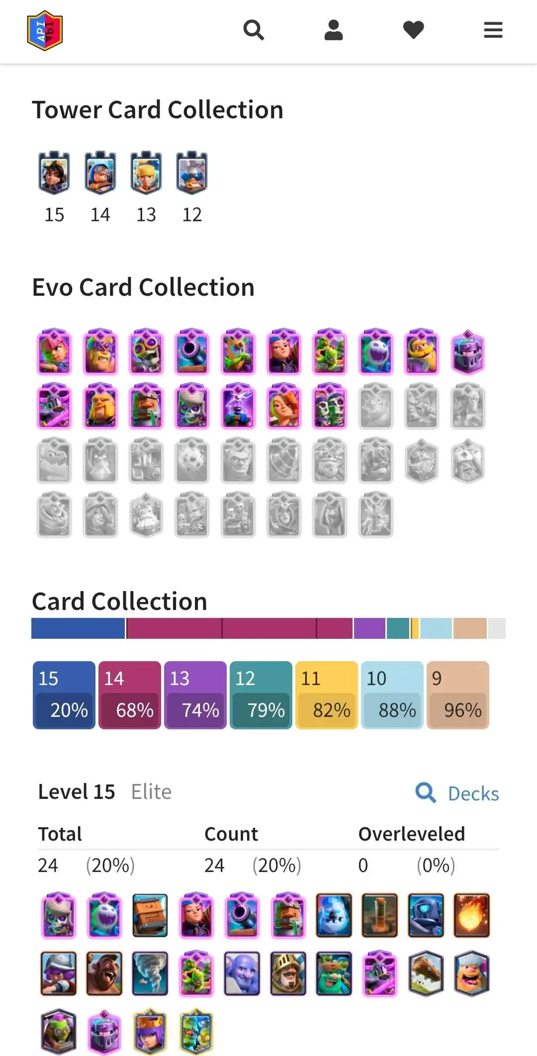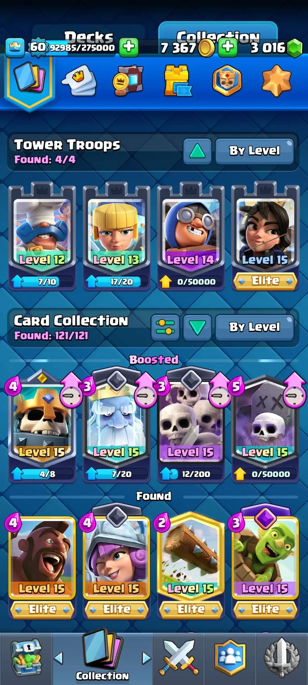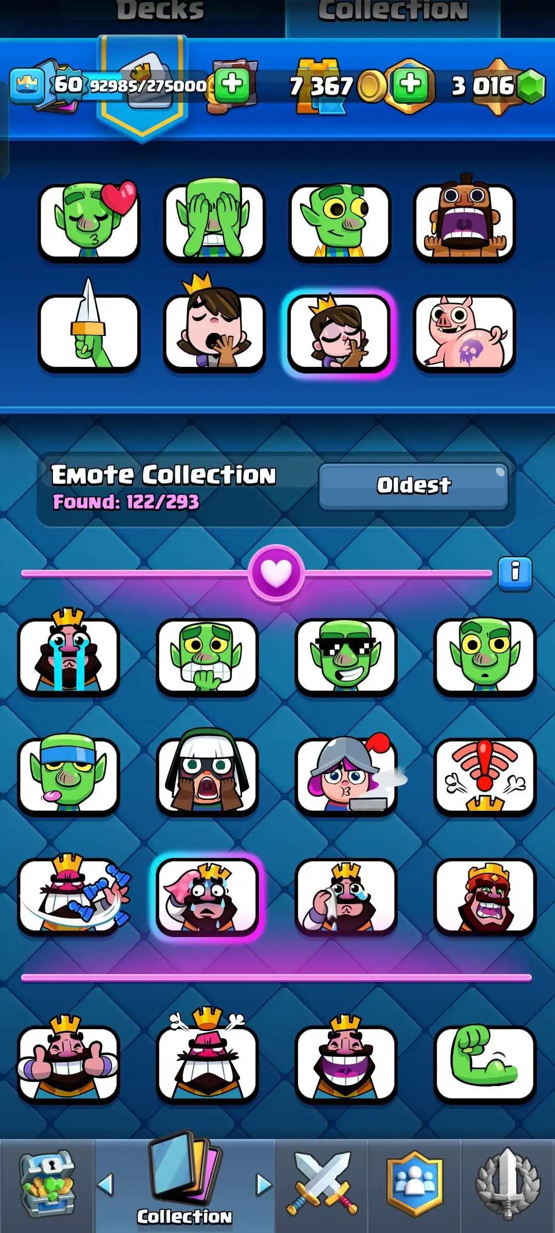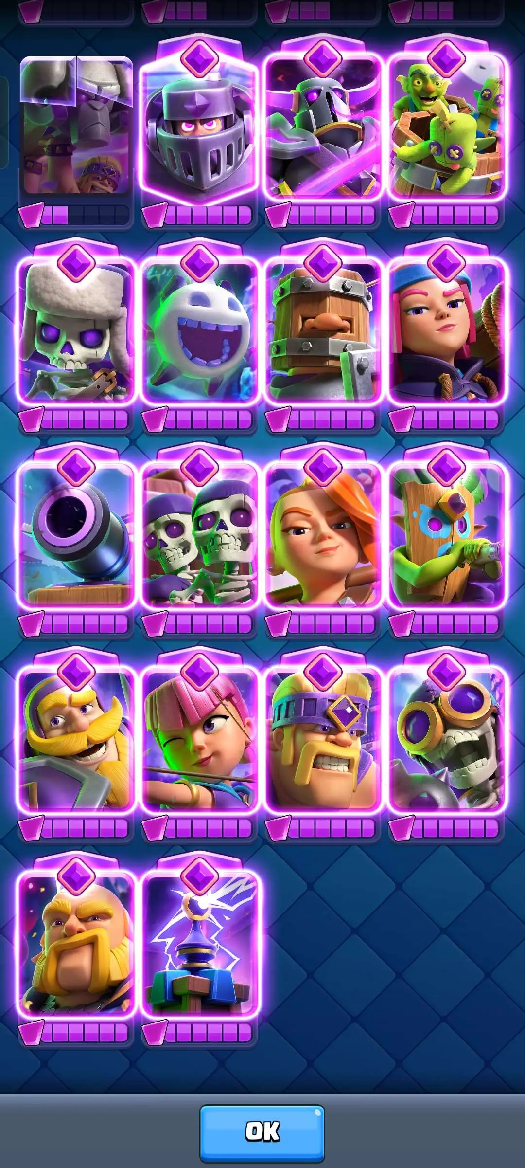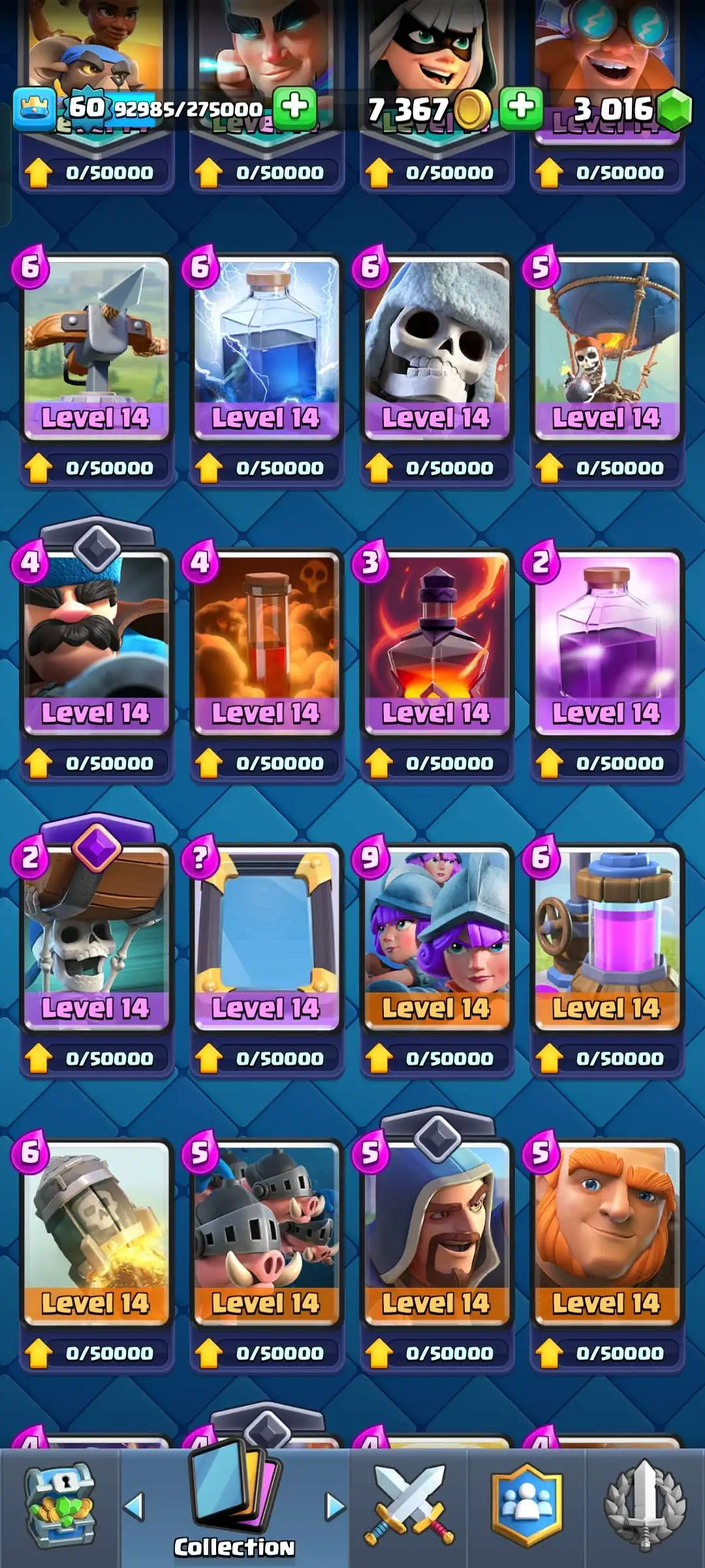 CR Lvl 60 ✨ 12750 Trophy ✨ KT 15 ✨ 24 Elite Cards ✨ 82 max cards ✨ 17 Evo Cards ✨ 122 Emotes ✨ 9 Tower skins