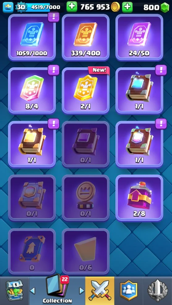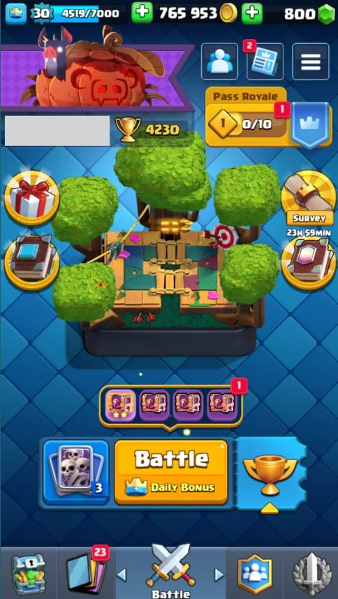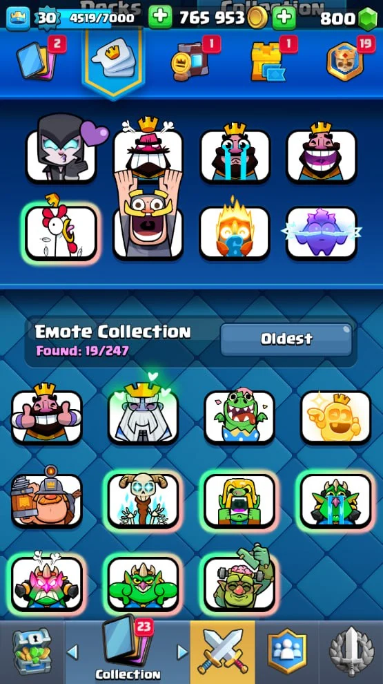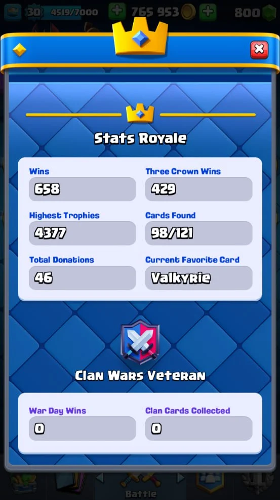 👑 KT 11 👑 4230 Trophy 👑 30 LVL 👑 98 Cards 👑 19 Emotes 👑 800 Gems 👑 765 k Gold 👑