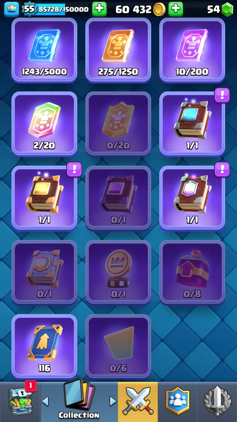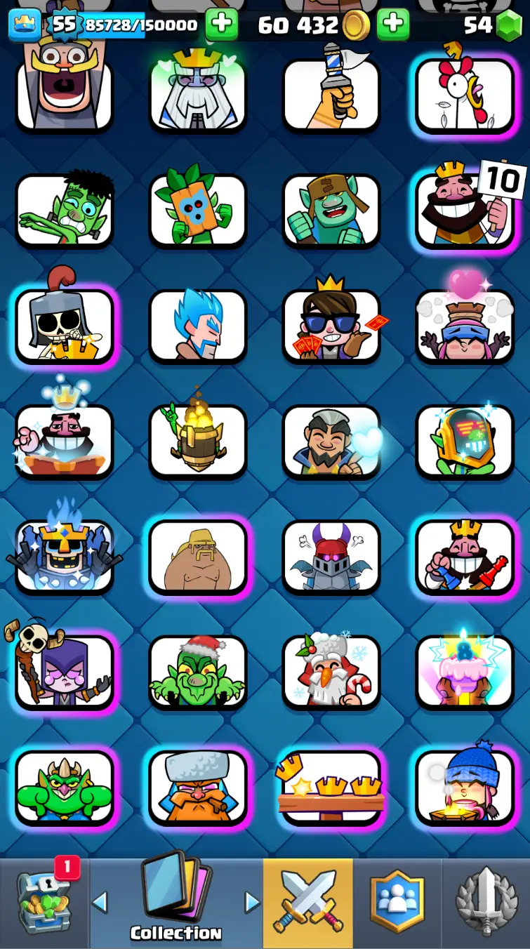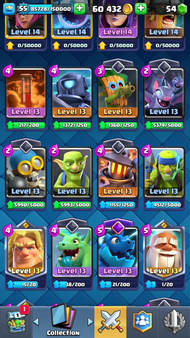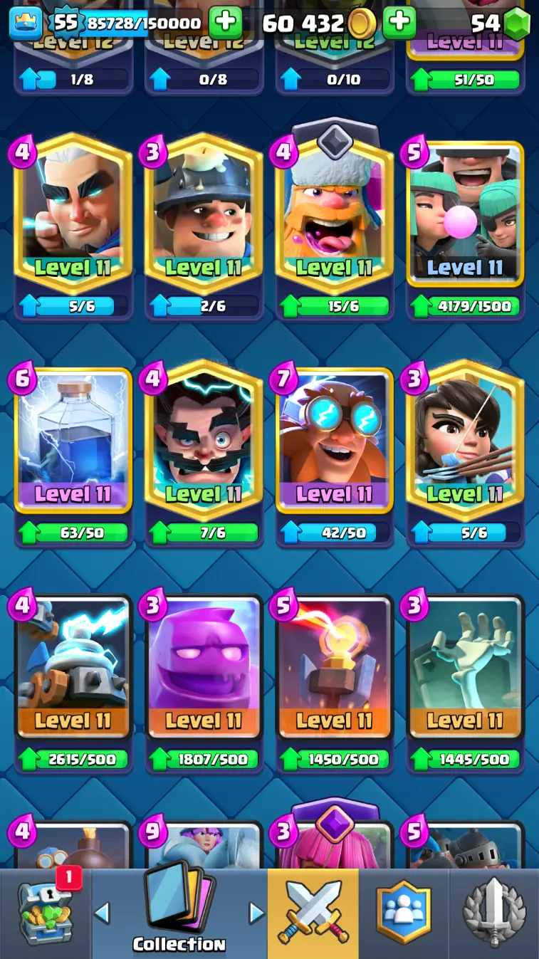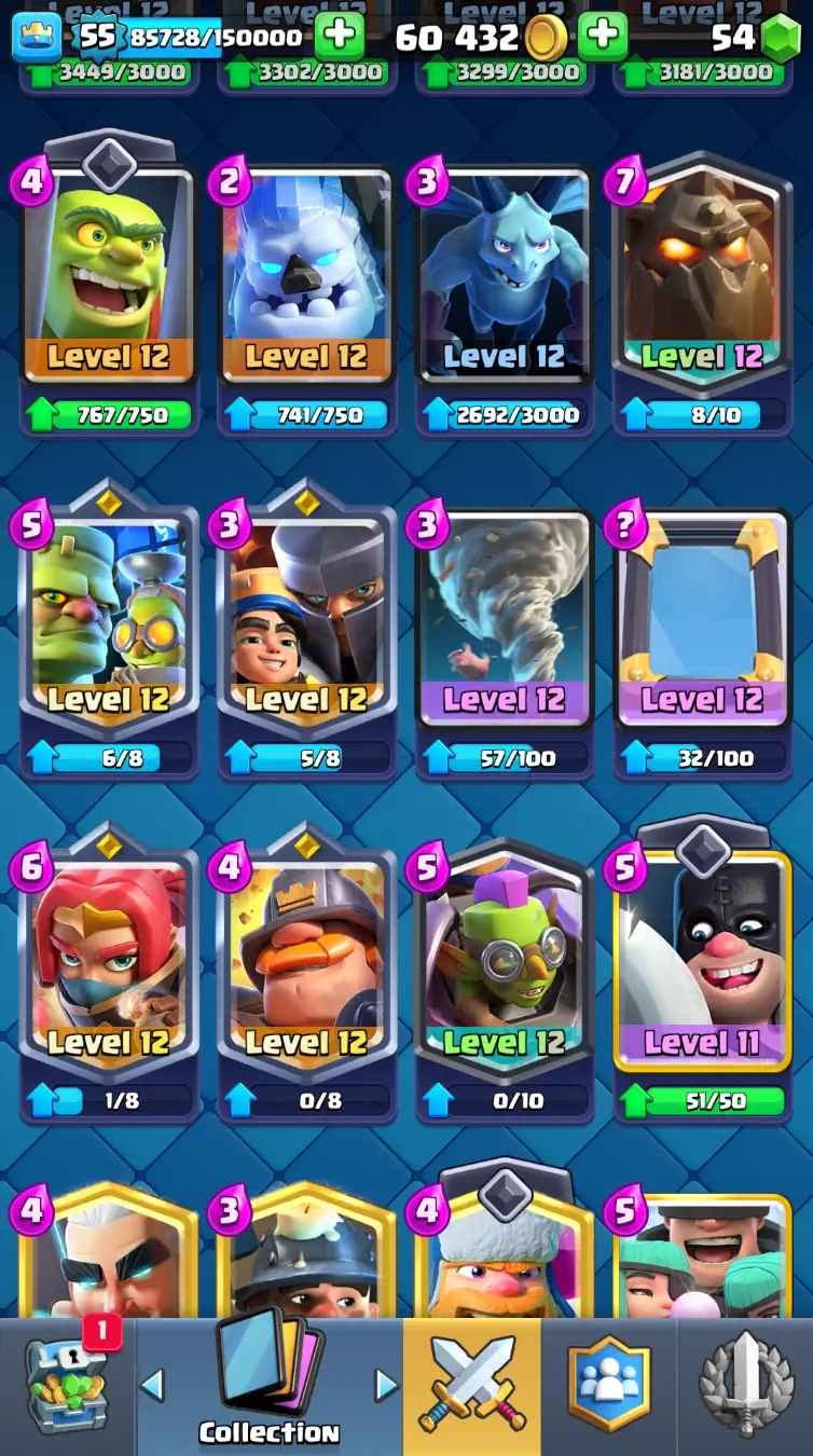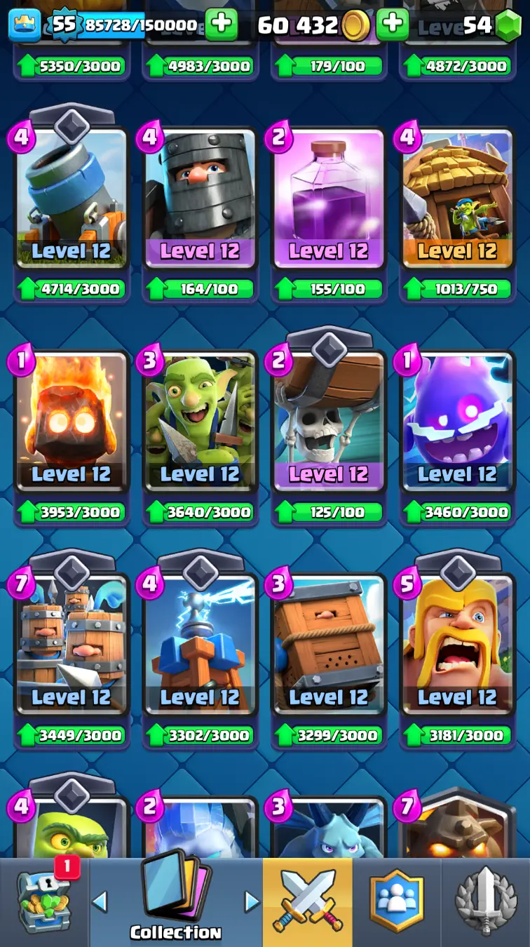◀️ KT 15 ▶️ LEVEL 55 🤩 12000 TROPHIES 🏆 9 ELITE CARD 🙀 12 MAX CARD 😎 5 EVO ☠️ 55 EMOTE 😍 4 SKIN 👽 121 CARDS 💳 60k GOLD 💰 54 GEMS 💎 RL69