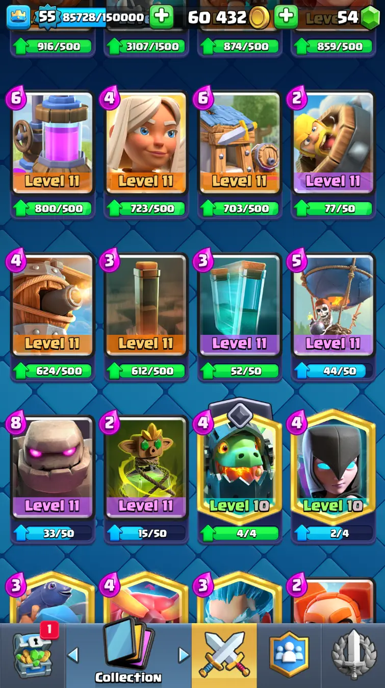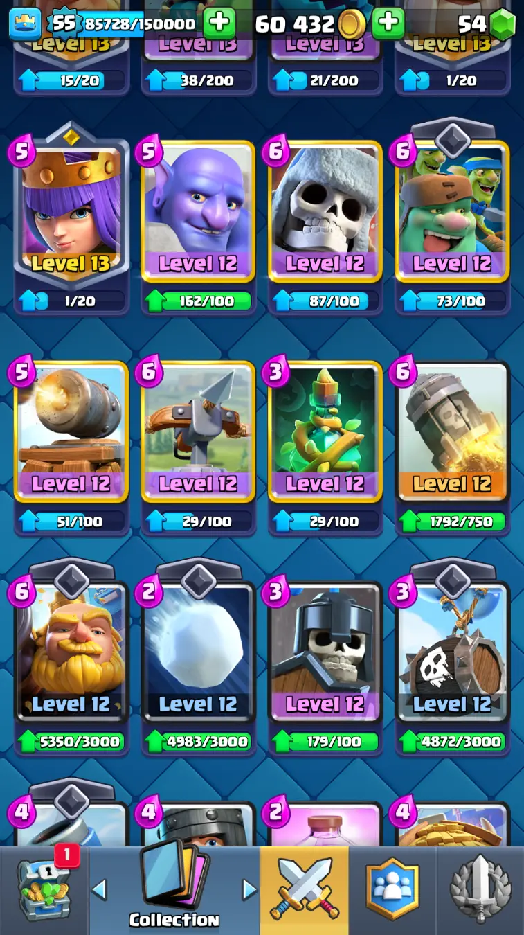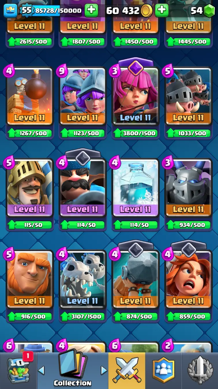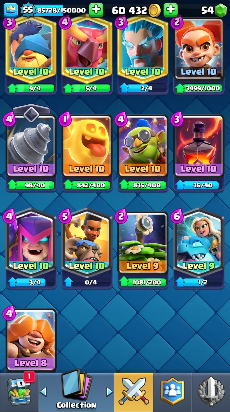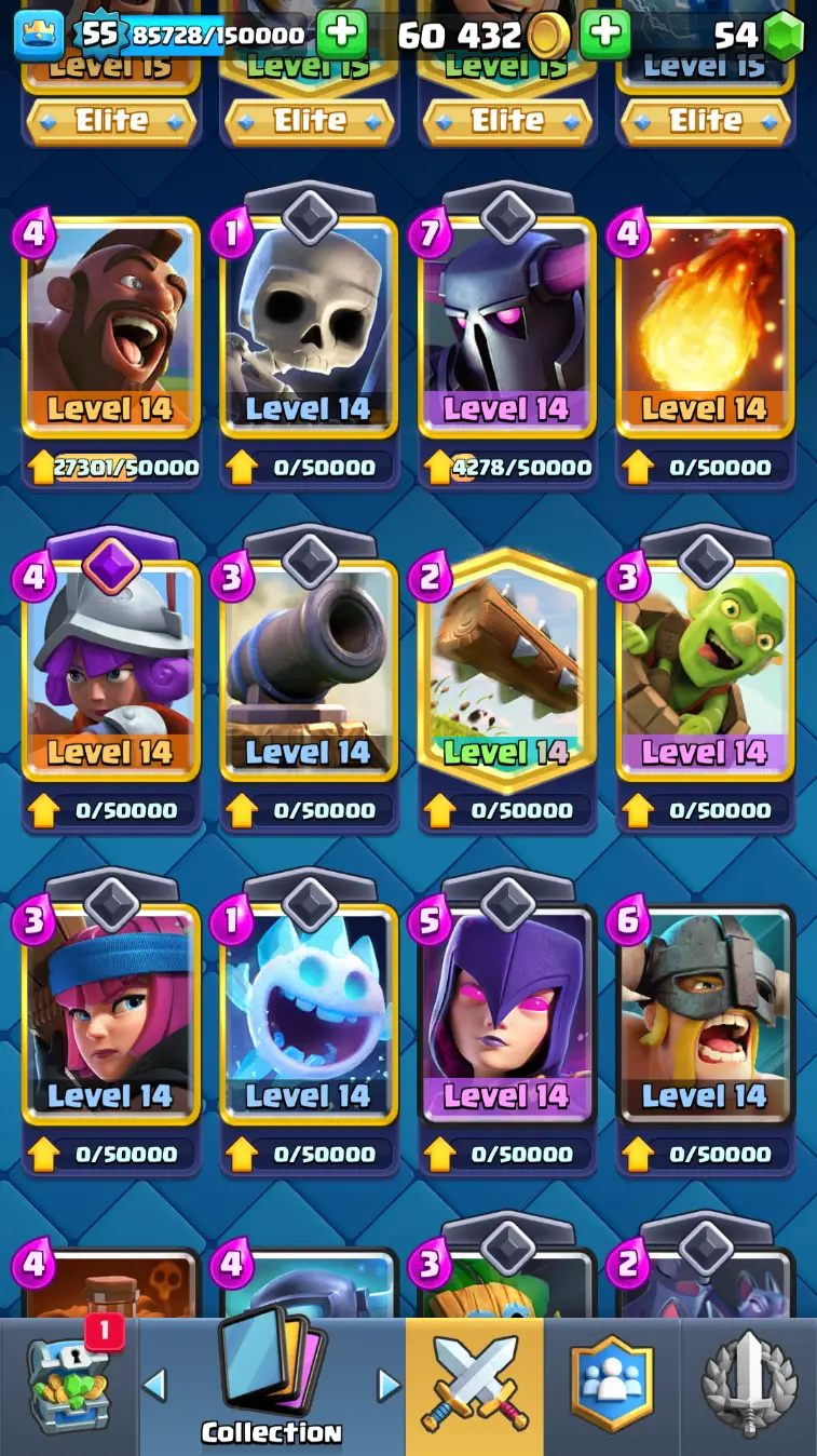 ◀️ KT 15 ▶️ LEVEL 55 🤩 12000 TROPHIES 🏆 9 ELITE CARD 🙀 12 MAX CARD 😎 5 EVO ☠️ 55 EMOTE 😍 4 SKIN 👽 121 CARDS 💳 60k GOLD 💰 54 GEMS 💎 RL69