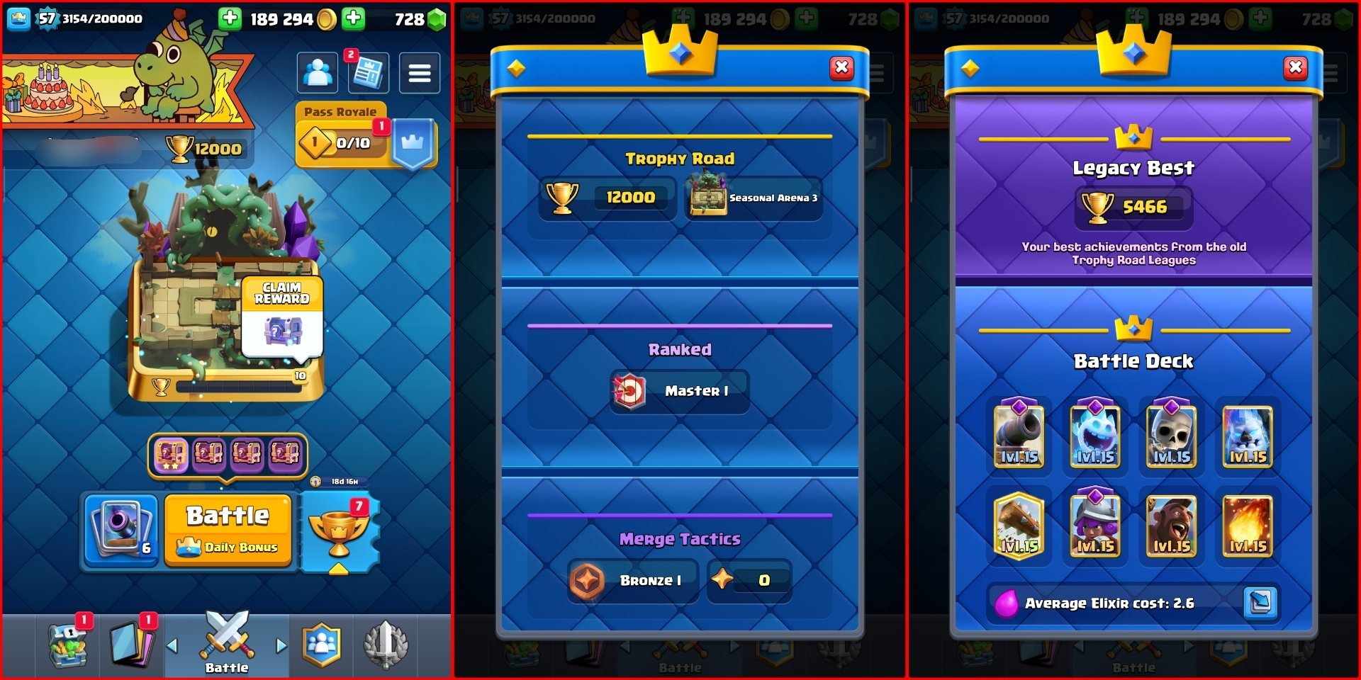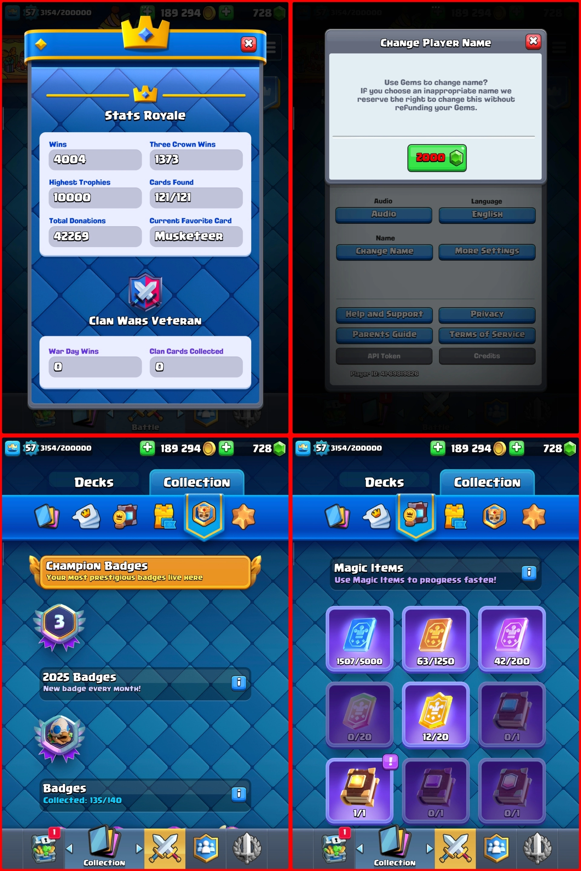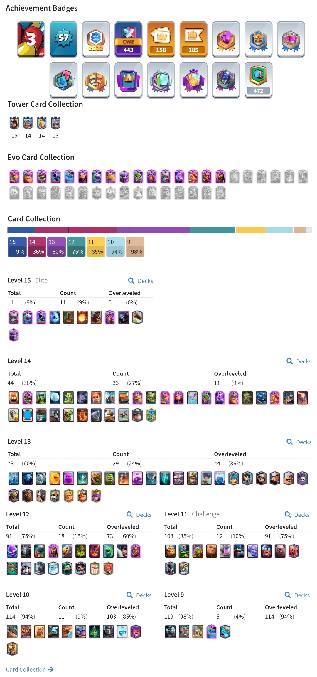 Level 57, 12k Trophies | 121 ALL Cards, 158 Nice Emotes | 16 Evos Unlock, 33 Cards Max Level 14 & 11 Level 15 | 29 Lvl-13, 18 Lvl-12 | RC9