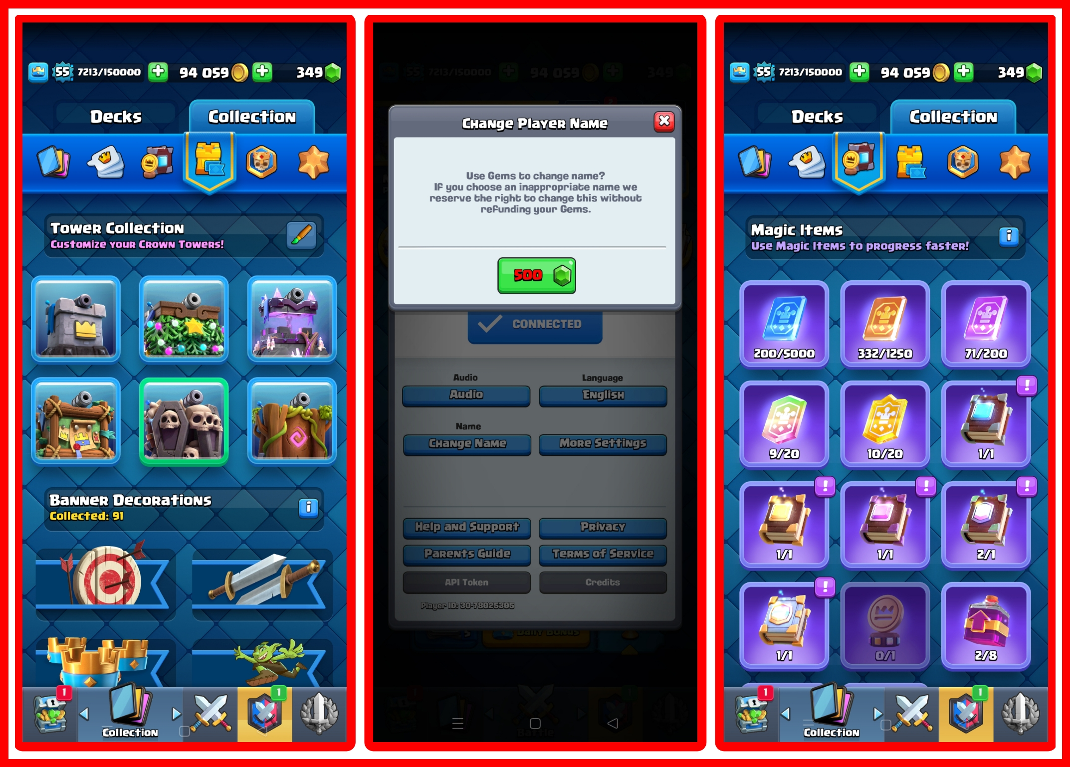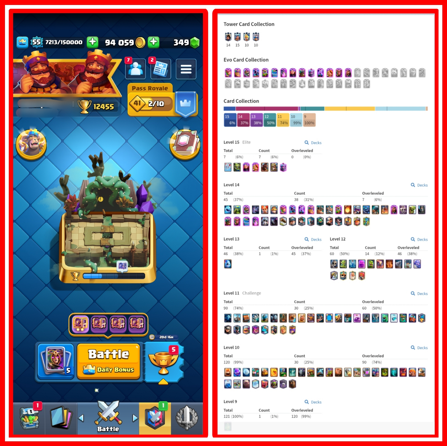 STACKED MAGIC ITEMS🤯14 EVOLUTION CARDS✨45 MAX CARDS😱LEVEL 55🤯12455 TROPHIES🏆7 ELITE CARDS😍SEASONAL ARENA LEVEL 3 😍KT LEVEL 15💖 NAME CHANGE 500 GEMS 💎☠️ CHEAP PRICE 💸 INSTANT DELIVERY☑️ANDROID & IOS ☑️