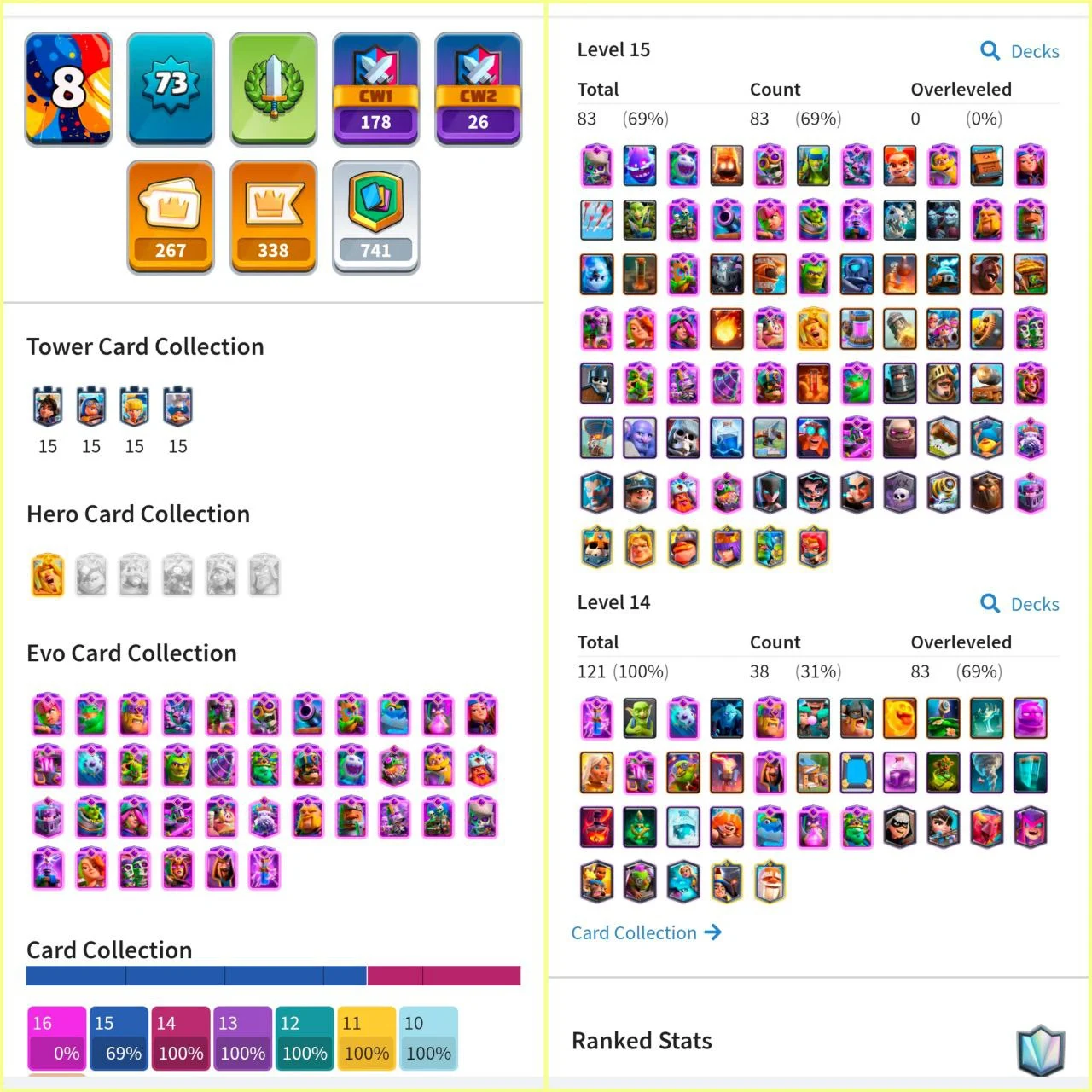 🔥ULTRA-CHEAP🔥ALL (39) EVOLUTION🔥87 CARDS LEVEL 15 (Elites)✅LEVEL 73⚡5M (FULL) GOLDS💰267 RAREST EMOTE😍50 TOWER SKINS⚡REST CARDS LVL14⚡ANDROID & iOS⚡