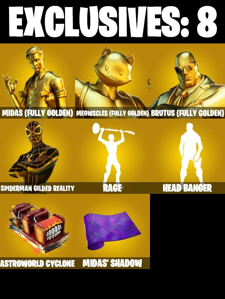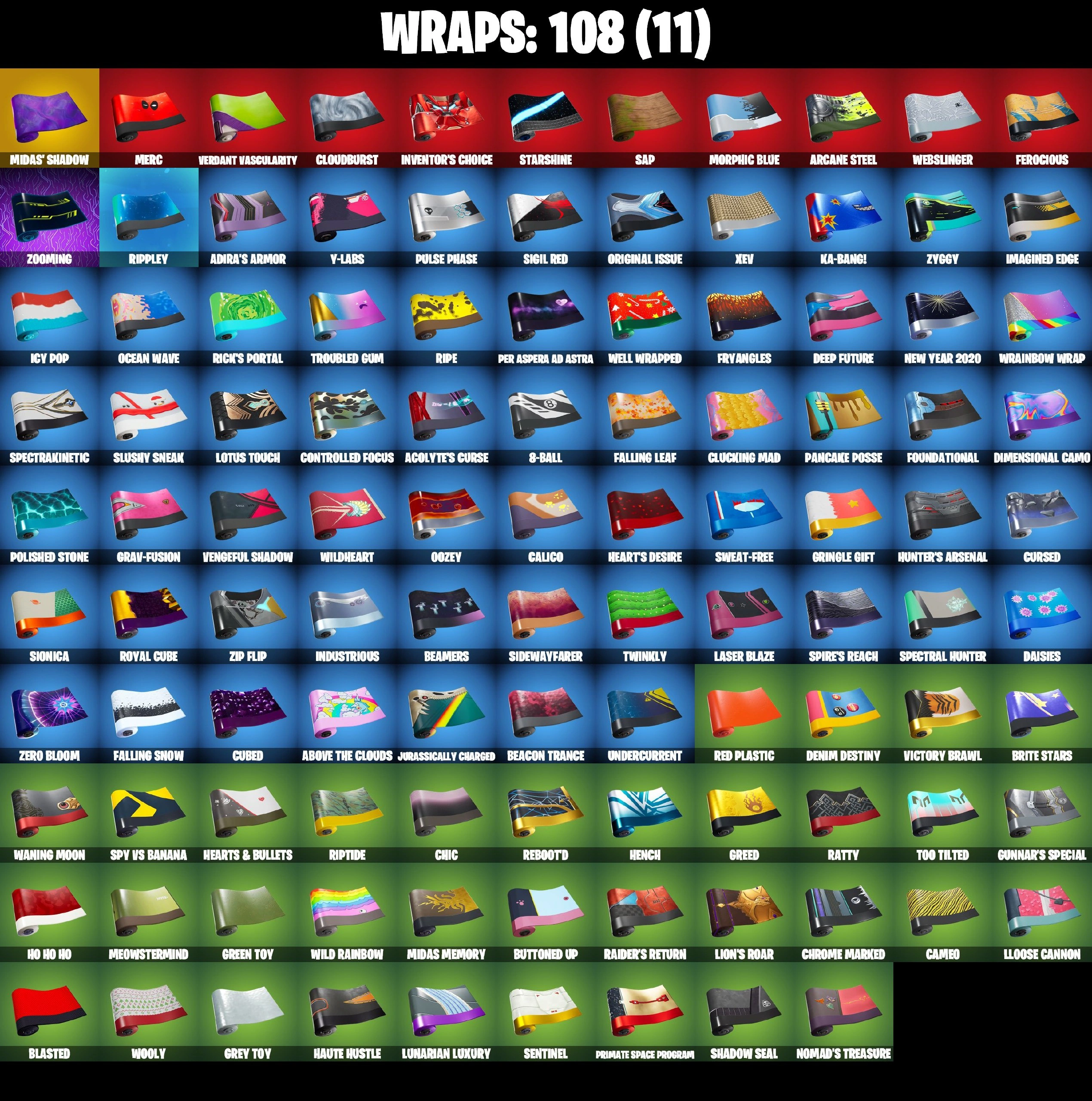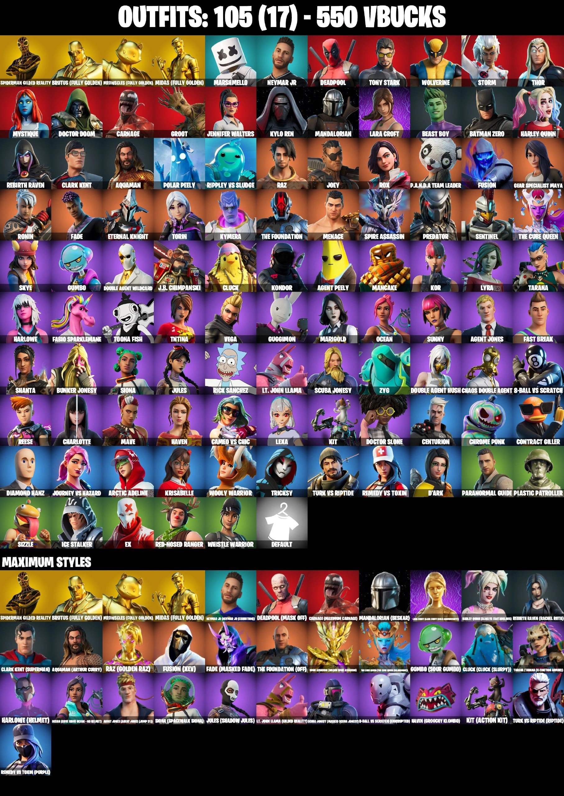 105 SKINS | GOLDEN LARA CROFT | FULL BESKAR MANDALORIAN | RACHEL ROTH | GILDED SPIDER-MAN | KYLO REN | PLASTIC PATROLLER | GOLDEN MIDAS | PREDATOR | DIAMOND HANZ | JULES MAX | JULES MAX | CHARLOTTE | KOR | AGENT PEELY | RED-NOSED