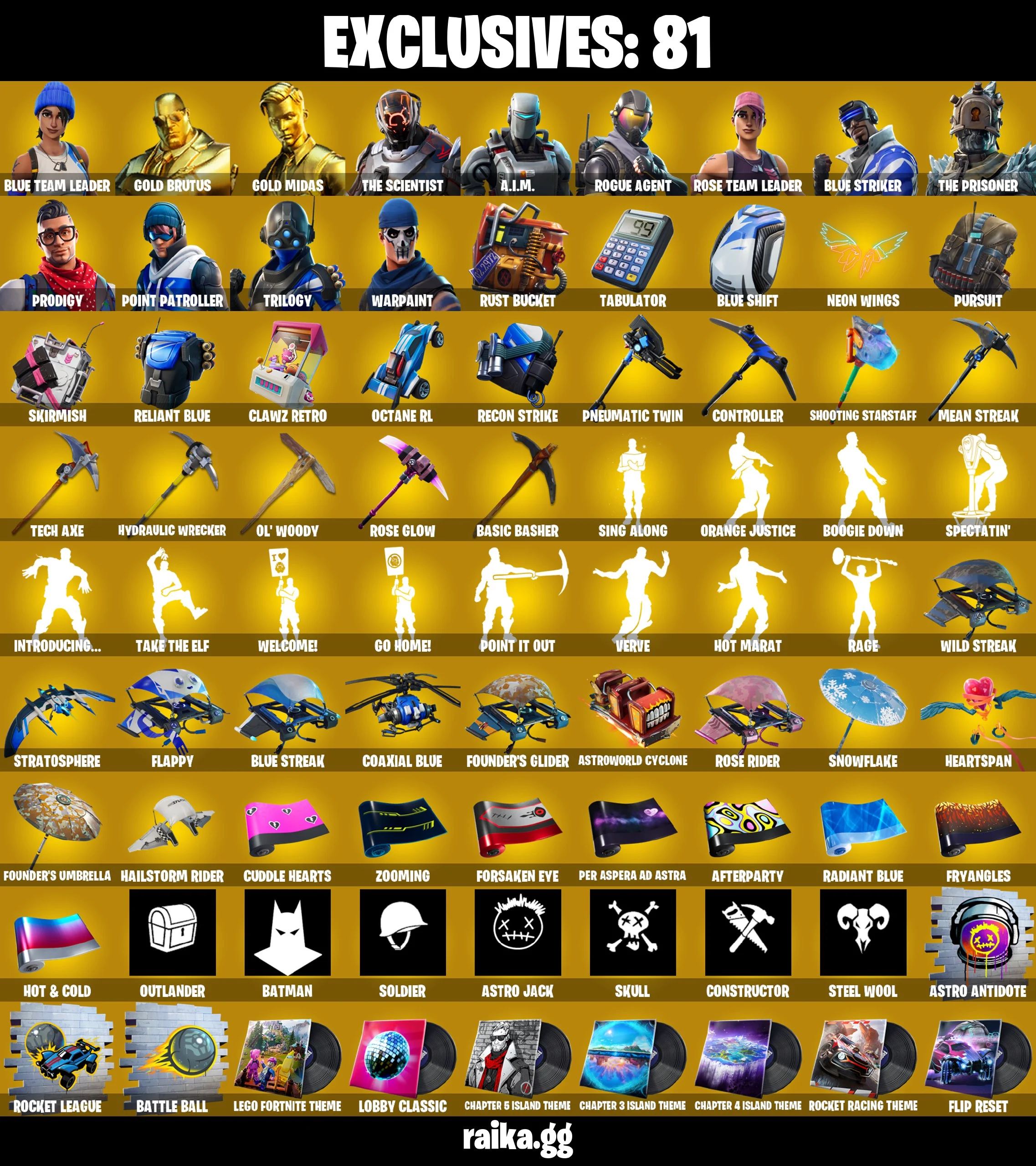 ๐112 SKINS โก๏ธPC/PSN/XBOXโก๏ธ BLUE TEAM LEADER ๐ GOLD BRUTUS ๐ GOLD MIDAS ๐ ROGUE AGENT ๐ PRODIGY ๐ OG STW โก๏ธ 1100 VB ๐ง MAIL CHANGEABLE #FM004