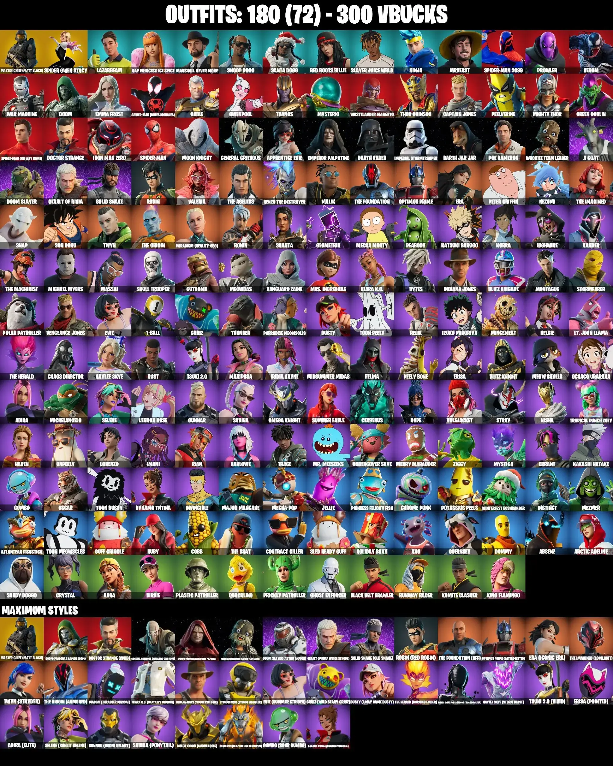 180 SKINS | MASTER CHIEF MAX | SHADY DOGGO | A GOAT | SPIDER-GWEN STACY | SPIDER-MAN 2099 | VENOM | GET GRIDDY | SPIDER-MAN MILES MORALES | STAR WAND | SPIDER-MAN NO WAY HOME | SPIDER-MAN | DARTH VADER | GENERAL GRIEVOUS MAX | APP