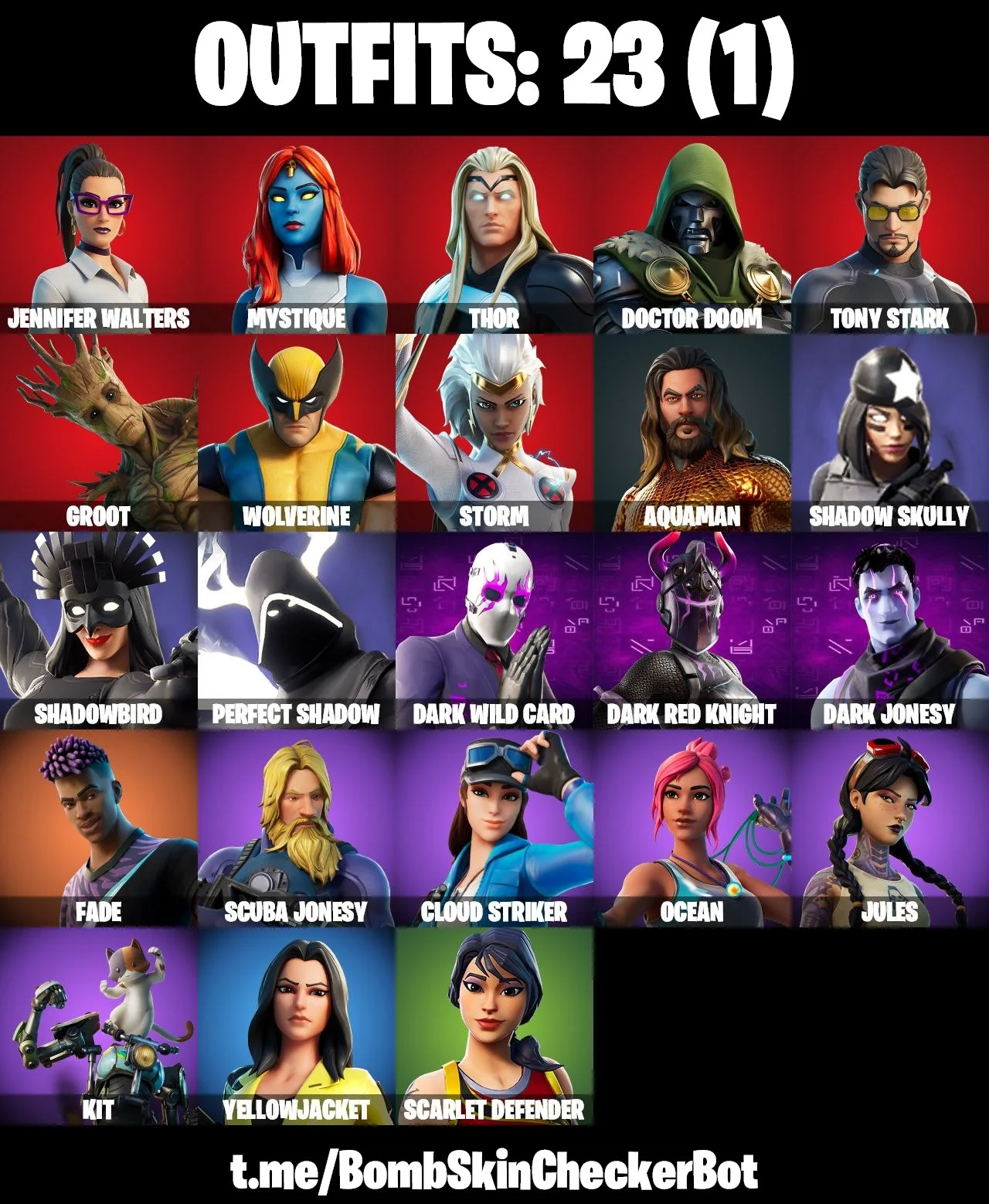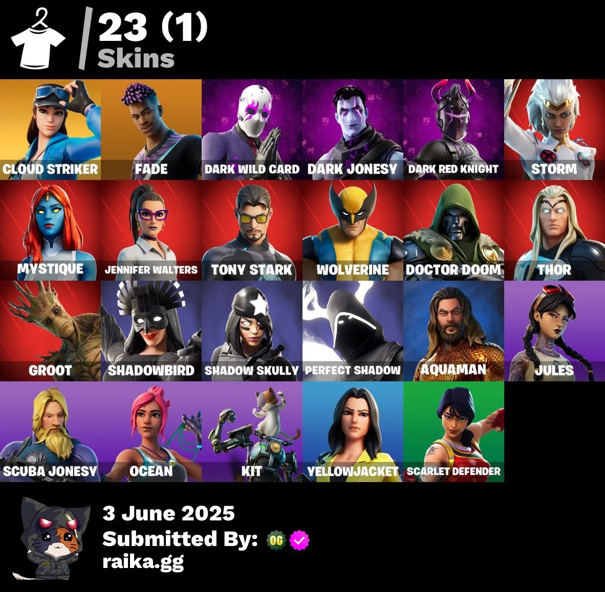 23 skins | Cloud Striker | Fade | Dark Wild Card | Dark Jonesy | Dark Red Knight | Storm | Mystique | Jennifer Walters | Tony Stark | Wolverine | Nai@1