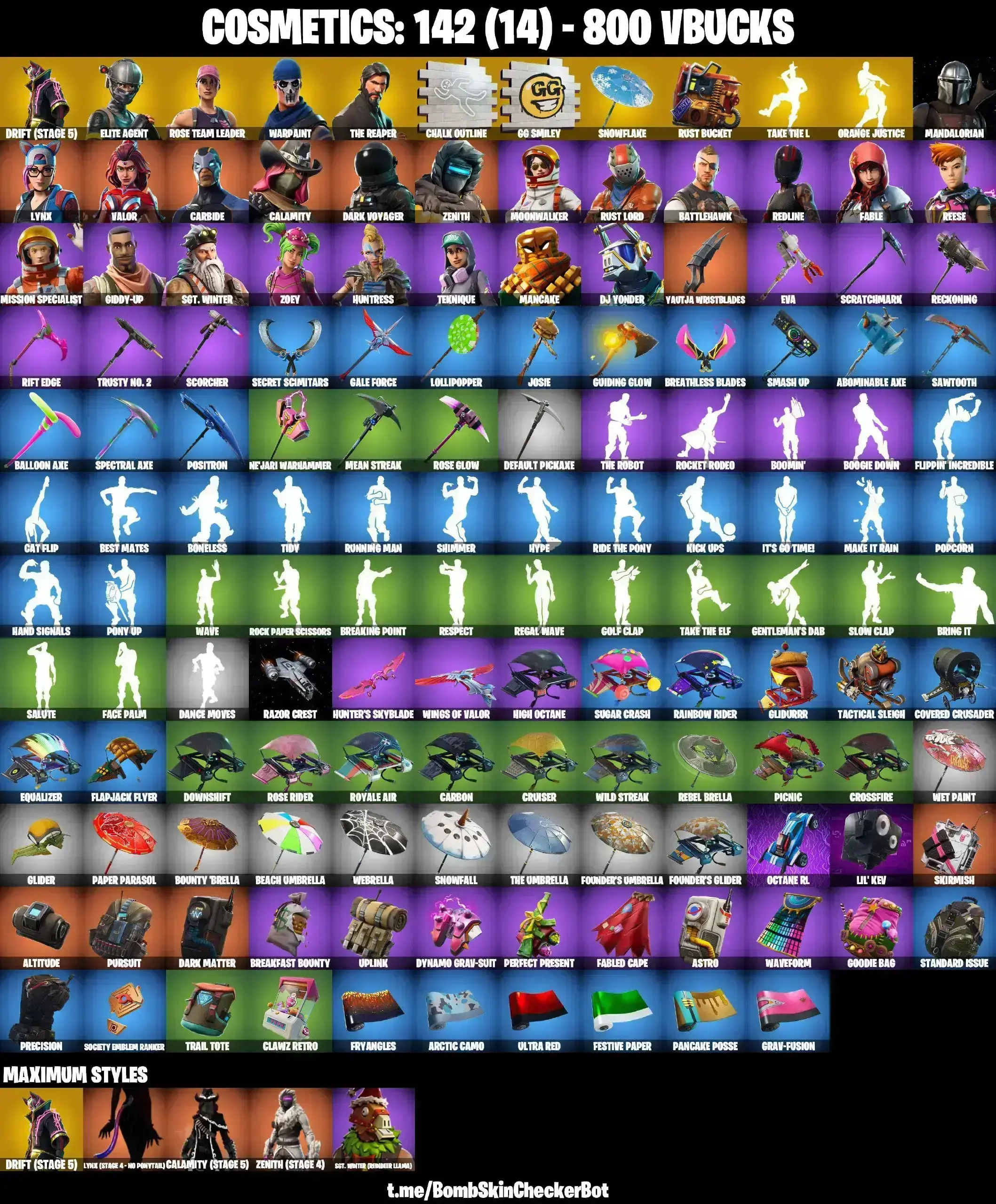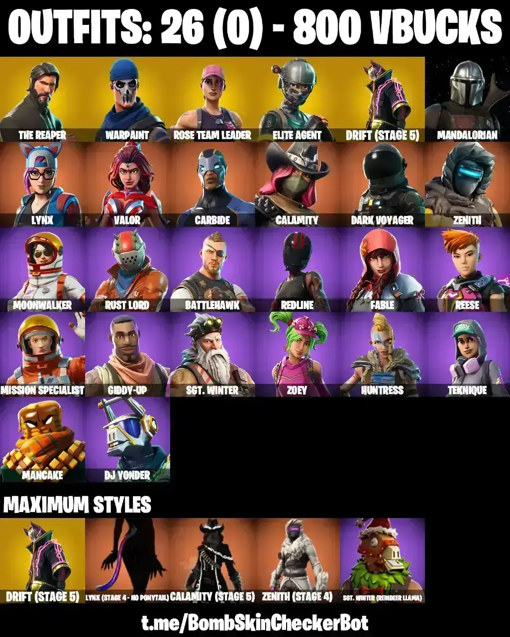 26 SKINS | TAKE THE L | THE REAPER | ELITE AGENT | OG STW | MANDALORIAN | ORANGE JUSTICE | TIDY | ZOEY | DRIFT STAGE 5 | LYNX STAGE 4 | SNOWFLAKE | RUST BUCKET | CAN PLAY ON PSN,XBOX,PC,NINTENDO,MOBILE | 800 VBUCKS | FULL EMAIL AC