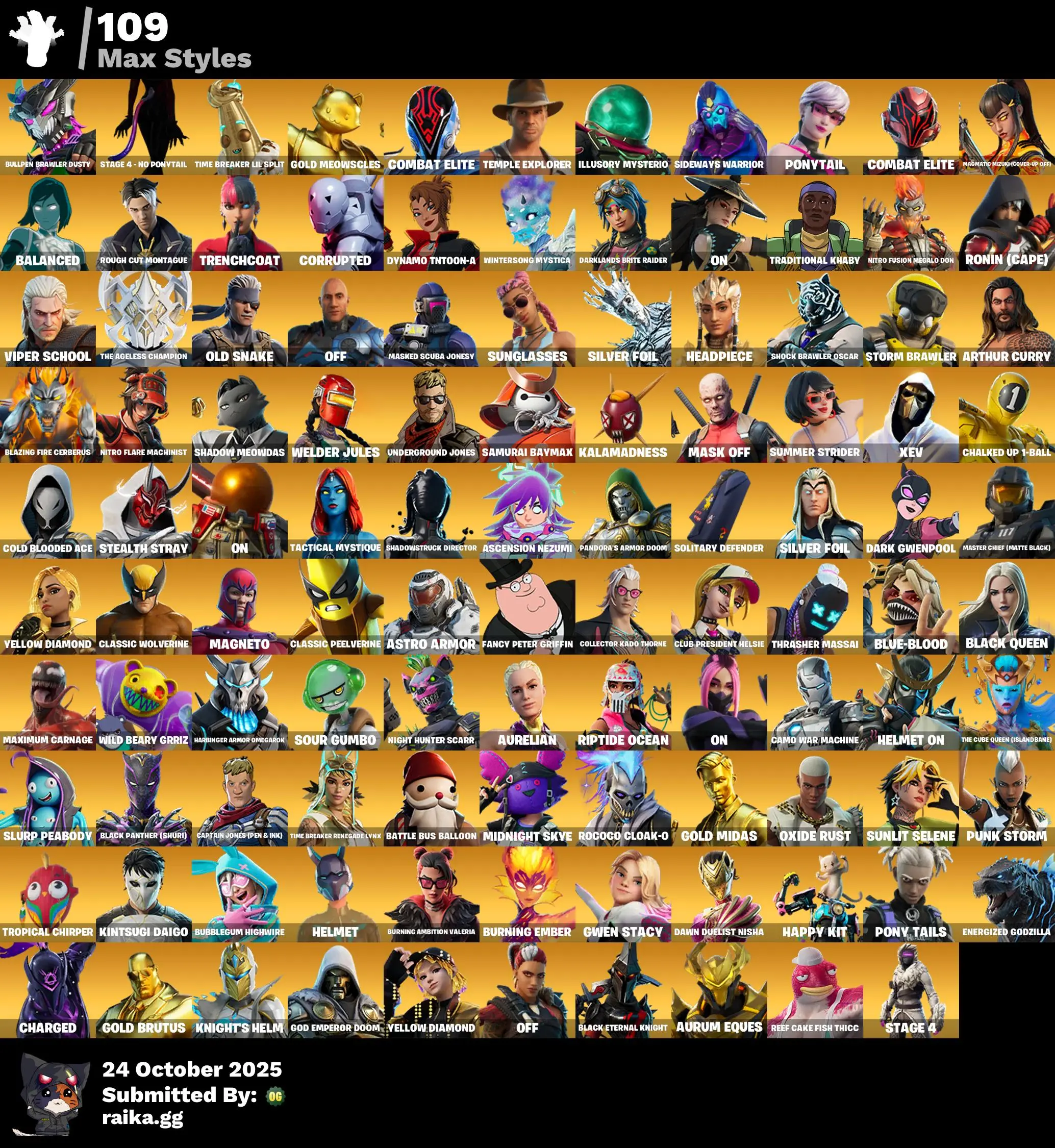 292 skins | The Ageless🎃The Foundation🎃Hunter🎃Eon🎃Omegarok🎃Zeus🎃Master Chief (Matte Black)🎃Spectra Knight🎃Kymera🎃Valeria🎃Mizuki🎃Joey🎃Twyn🎃Kado Thorne🎃Fusion🎃Nezumi🎃Gold Brutus🎃Gold Meowscles🎃Tart Tycoon🎃Lynx🎃Era🎃Gold Midas D5194