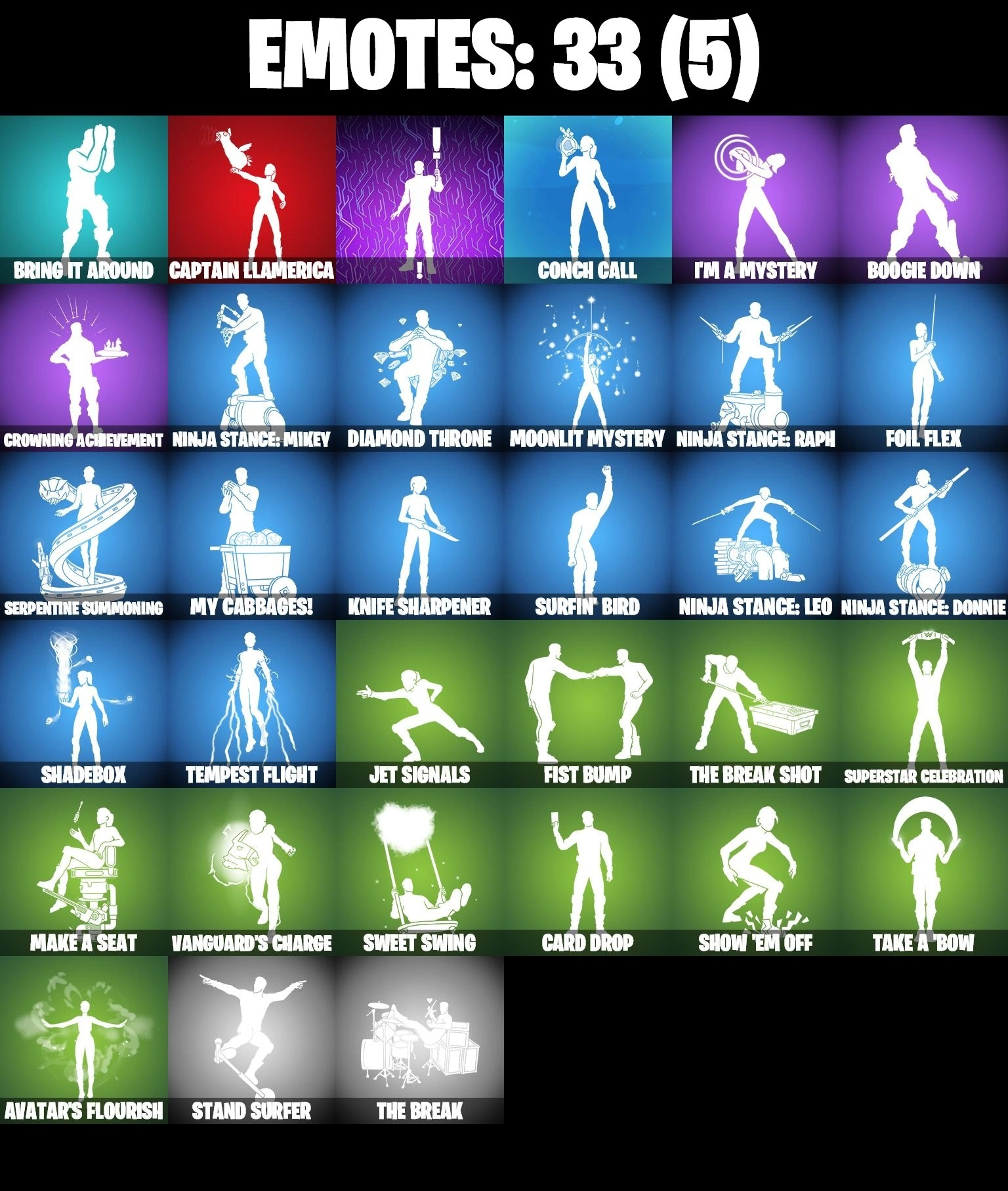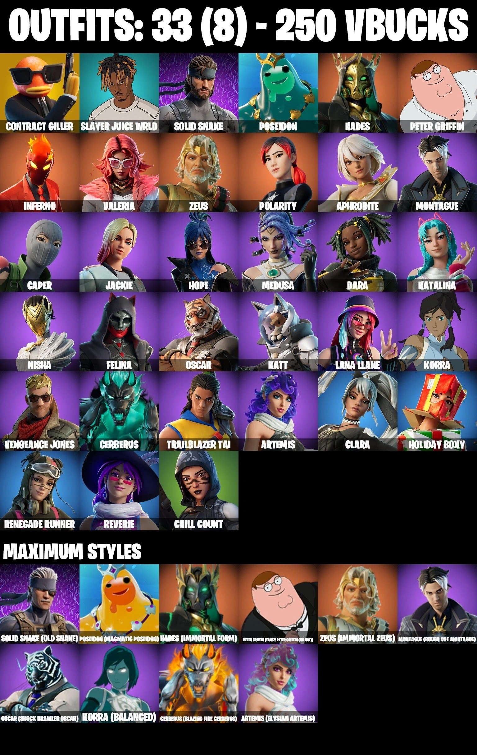 33 SKINS ⸱ CONTRACT GILLER ⸱ POLARITY ⸱ SOLID SNAKE ⸱ RENEGADE RUNNER ⸱ CAPER ⸱ ICE BREAKER ⸱ SKULLY SCEPTRE ⸱ BRING ME AROUND ⸱ CONCH CALL ⸱ KORRA ⸱ DARA ⸱ KATALINA ⸱ CLARA ⸱ VALERIA ⸱ HADES ⸱ LANA LLANE ⸱ NISHA ⸱ APHRODITE ⸱ INF