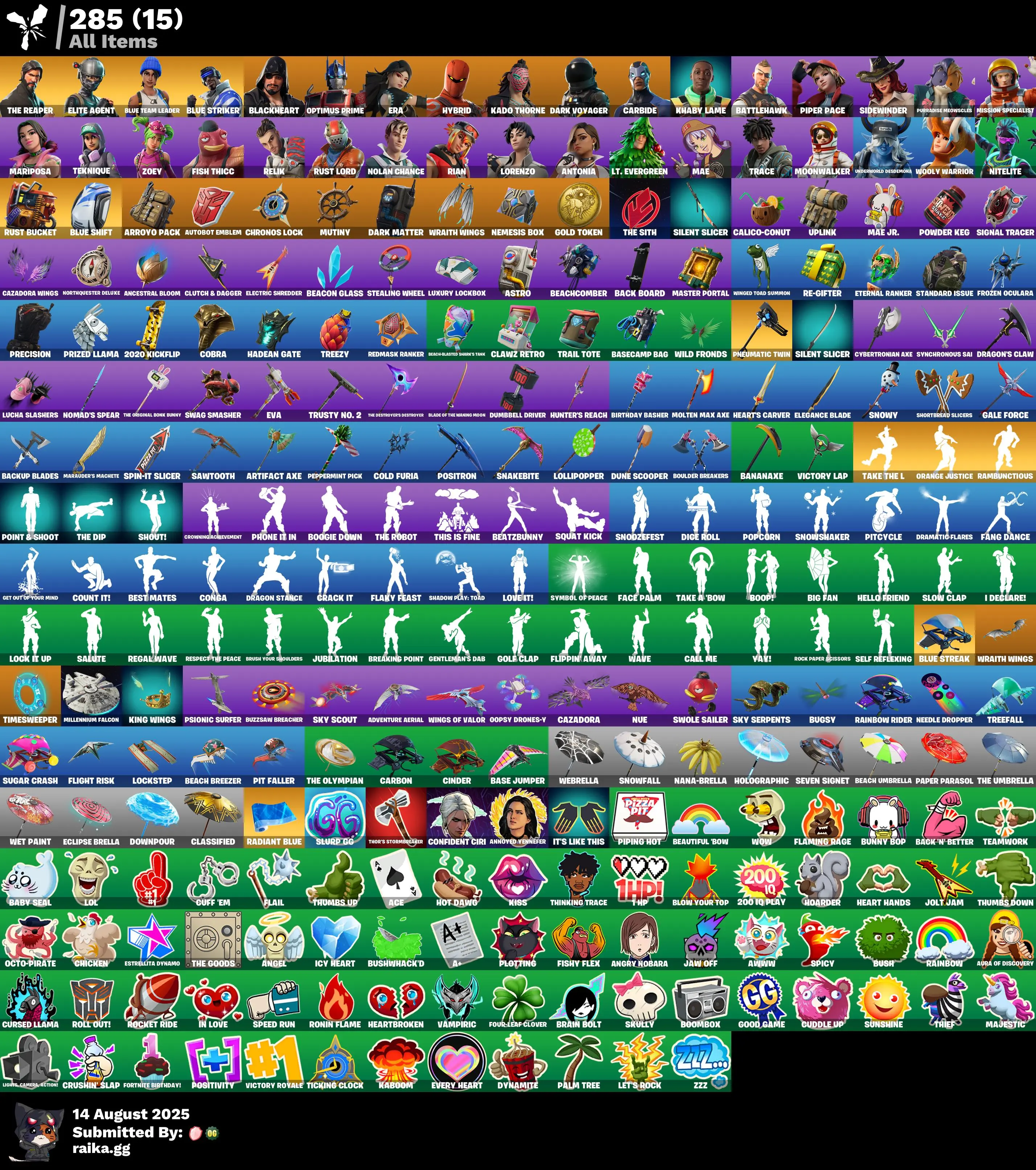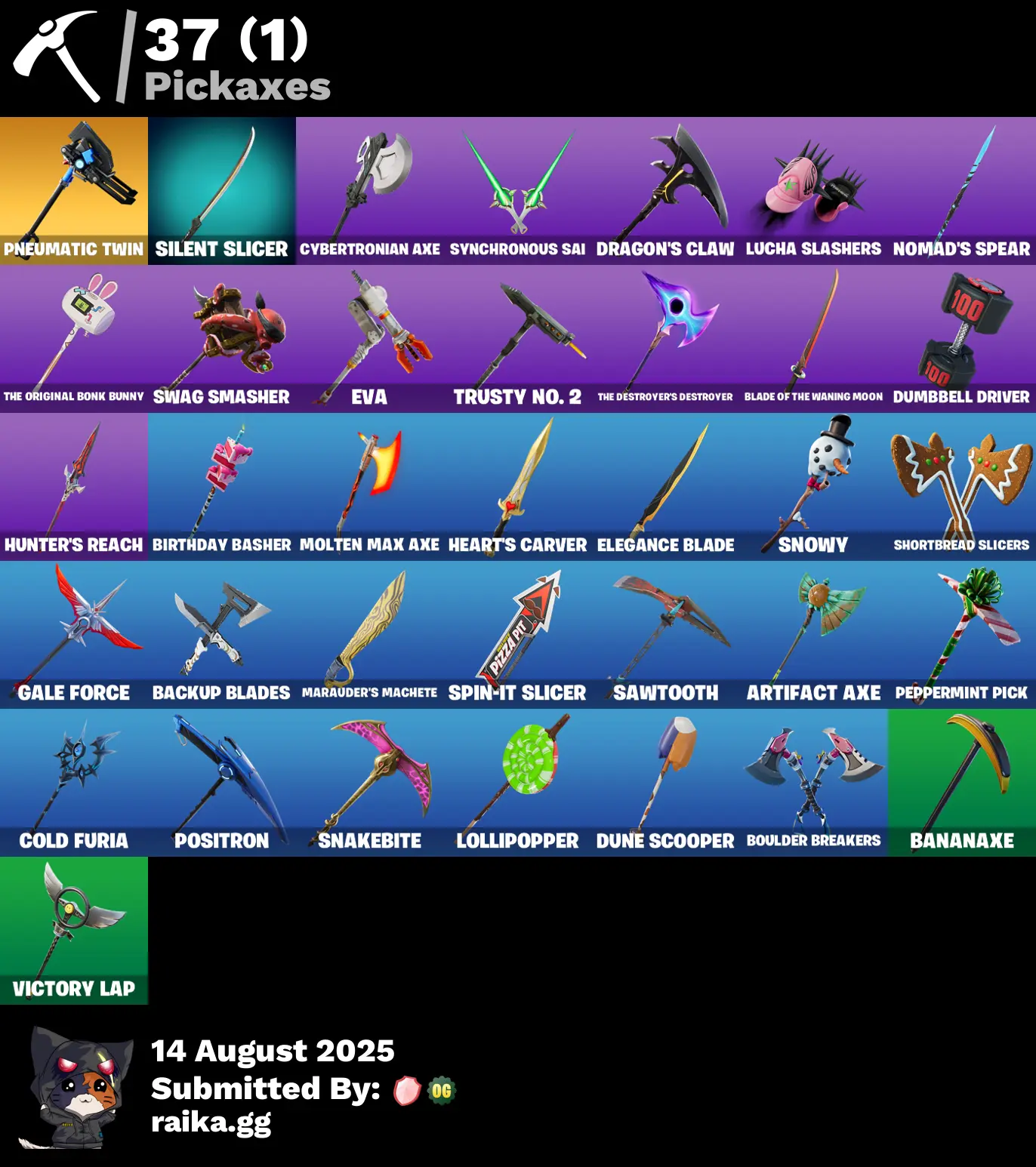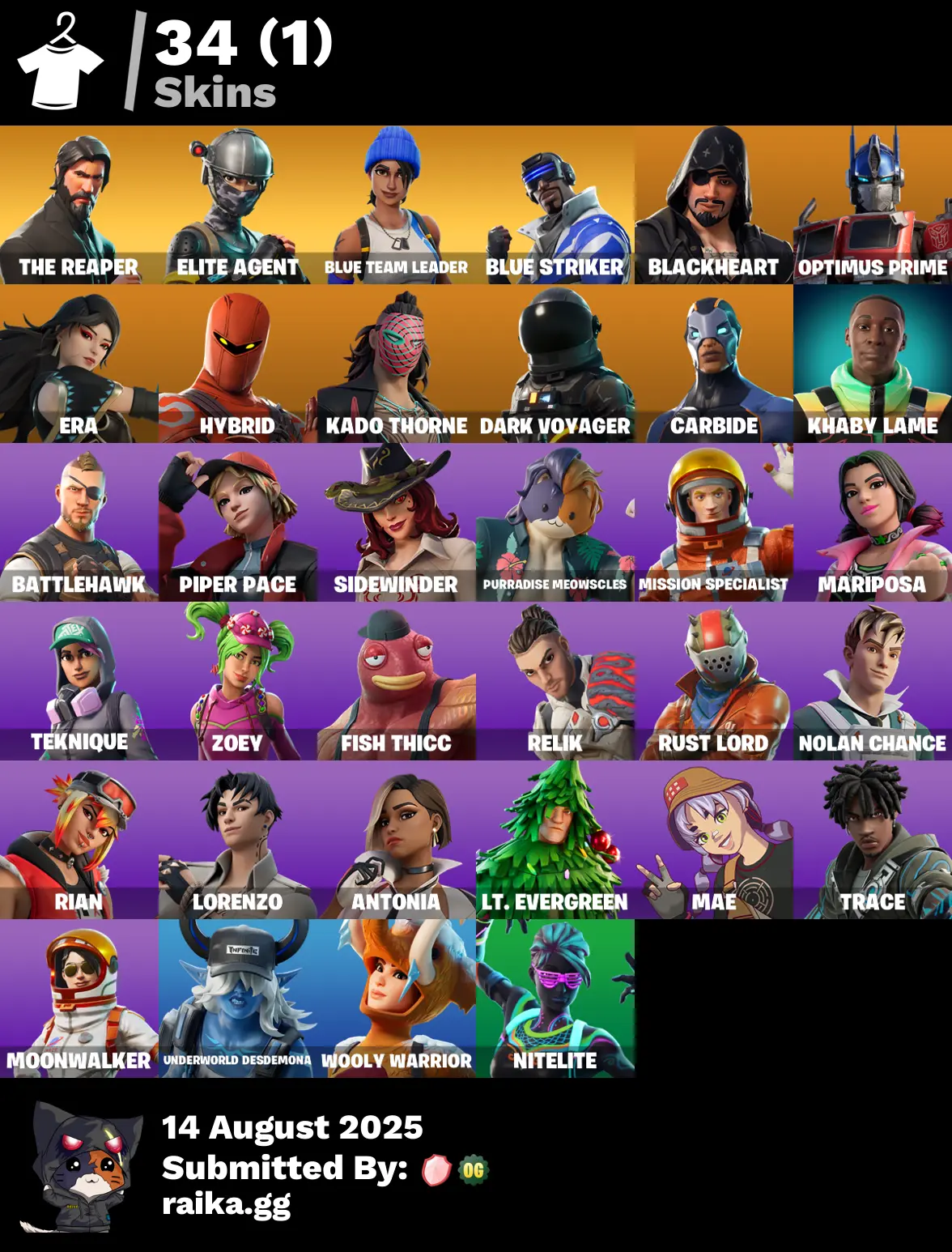 34 skins | The Reaper❄️Take The L❄️Elite Agent❄️Orange Justice❄️The Dip❄️Gentleman's Dab❄️Oopsy Drones-y❄️Beach Breezer❄️Artifact Axe❄️Flippin' Away❄️Snowfall❄️Birthday Basher❄️Dragon's Claw❄️Gale Force❄️Fang Dance❄️Timesweeper❄️Optimus Prime❄️Relik D4291