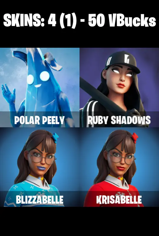 4 SKINS 🔥 Polar Peely | Ruby Shadows | Blizzabelle | Krisabelle | Clawz Retro | Lunar Hyperjet | Datafiber Chargepack | Blackout Bag | Ancestral Bloom | Legend's Modkit | Kata-Pack | The Bestiary Chest | Fishstick Janky