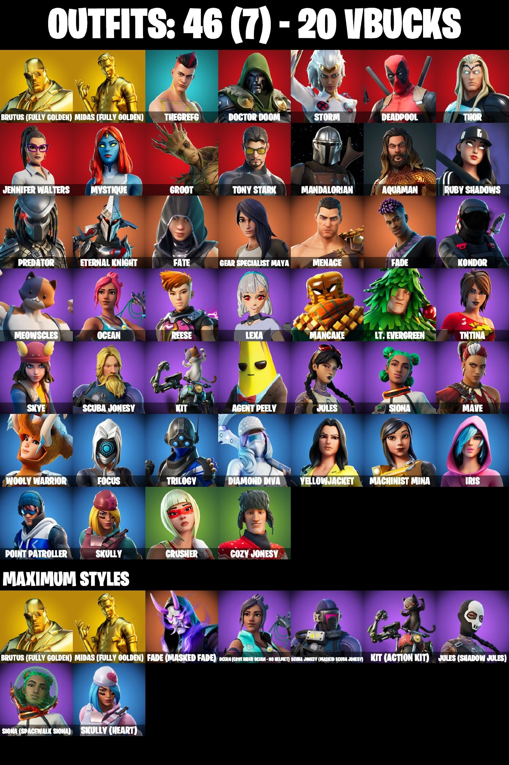 46 SKINS ⸱ LEVIATHAN AXE ⸱ CANDY AXE ⸱ RAGE ⸱ FATE ⸱ MENACE ⸱ EVERGREEN ⸱ FADE ⸱ TNTINA ⸱ MANCAKE ⸱ LEXA ⸱ SKYE ⸱ EVERGREEN ⸱ CRUSHER ⸱ ETERNAL KNIGHT ⸱ IRIS ⸱ DIAMOND DIVA ⸱ IRIS ⸱ RUBY SHADOWS ⸱ DEADPOOL ⸱ GOLDEN BRUTUS ⸱ ICE BR