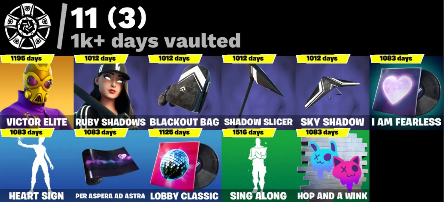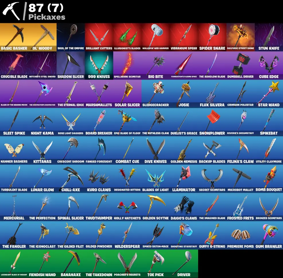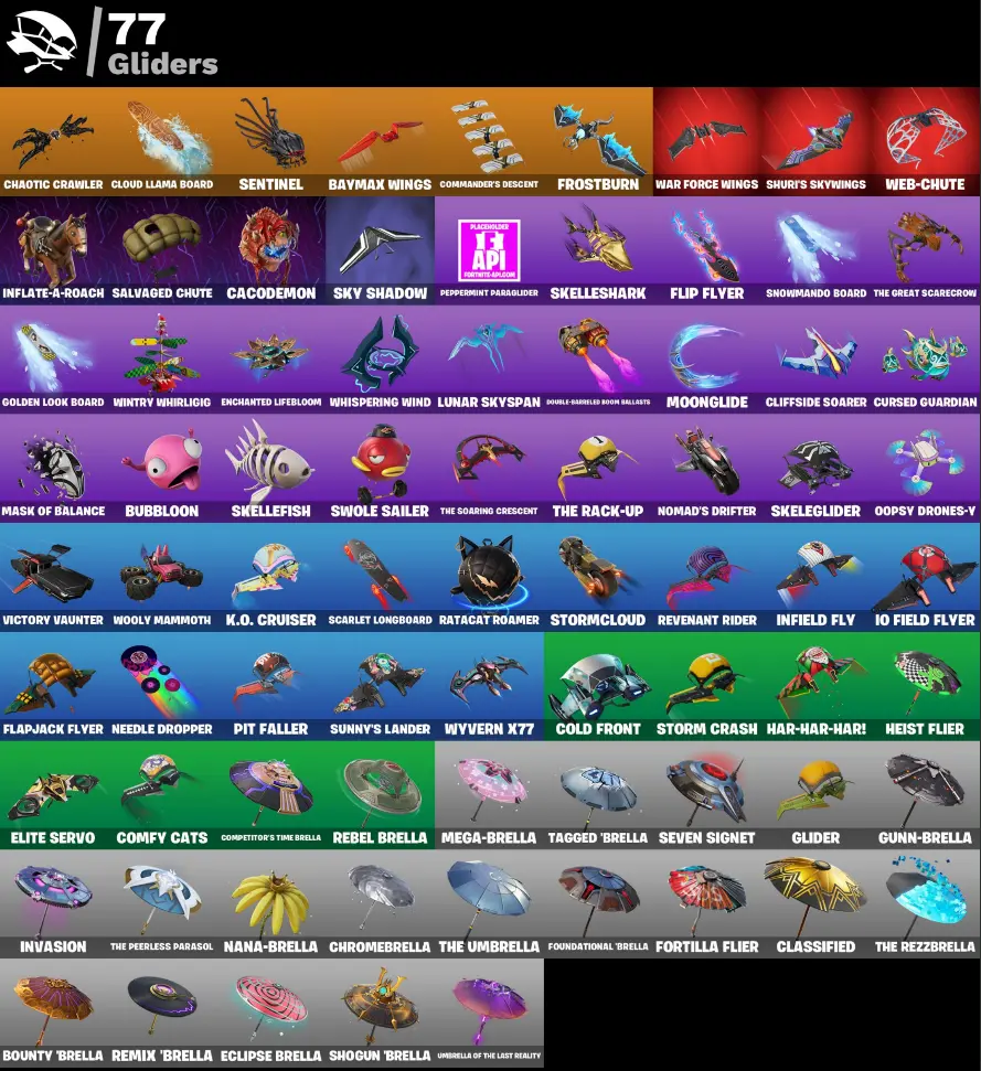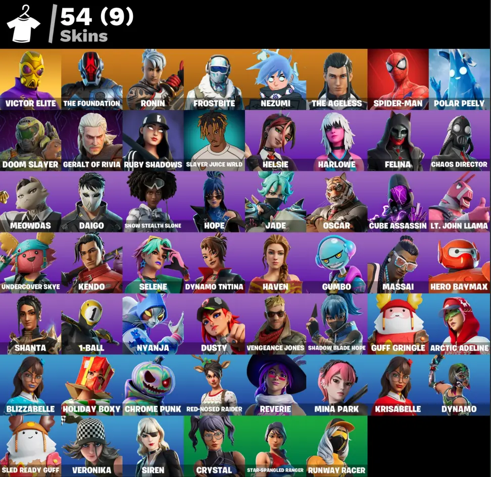 54 skins βΈ± For all platforms, Victor Elite | Ruby Shadows | The Foundation | Ronin | Frostbite | Nezumi | The Ageless | Spider-Man | Polar Peely | Doom Slayer | Geralt of Rivia | Basic Basher