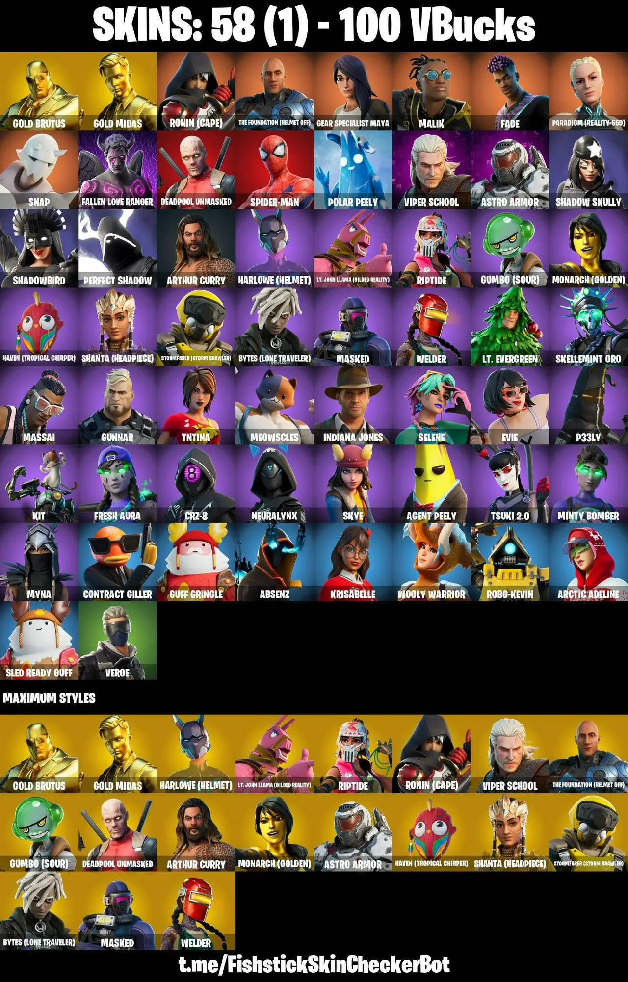 โก58 Skins [PC/PSN/XBOX]๐ Gold Brutus ๐ Gold Midas โ๏ธ Ronin ๐ชฝ Fallen Love Ranger ๐ท๏ธ Deadpool Unmasked ๐ธ๏ธ Spider-Man ๐ FO514
