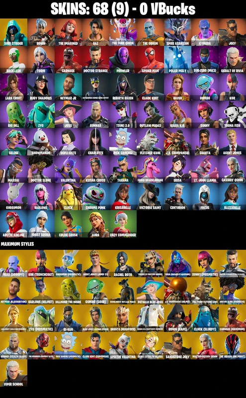 68 SKINS 🔥 Star Wand | Get Griddy | Lara Croft | Backlash | Aura | Focus | Kor | Surf Strider | Ronin | The Imagined | Raz | The Cube Queen | The Origin | Spire Assassin | Kymera | Joey | Torin | Carnage | Doctor Strange | Prowler