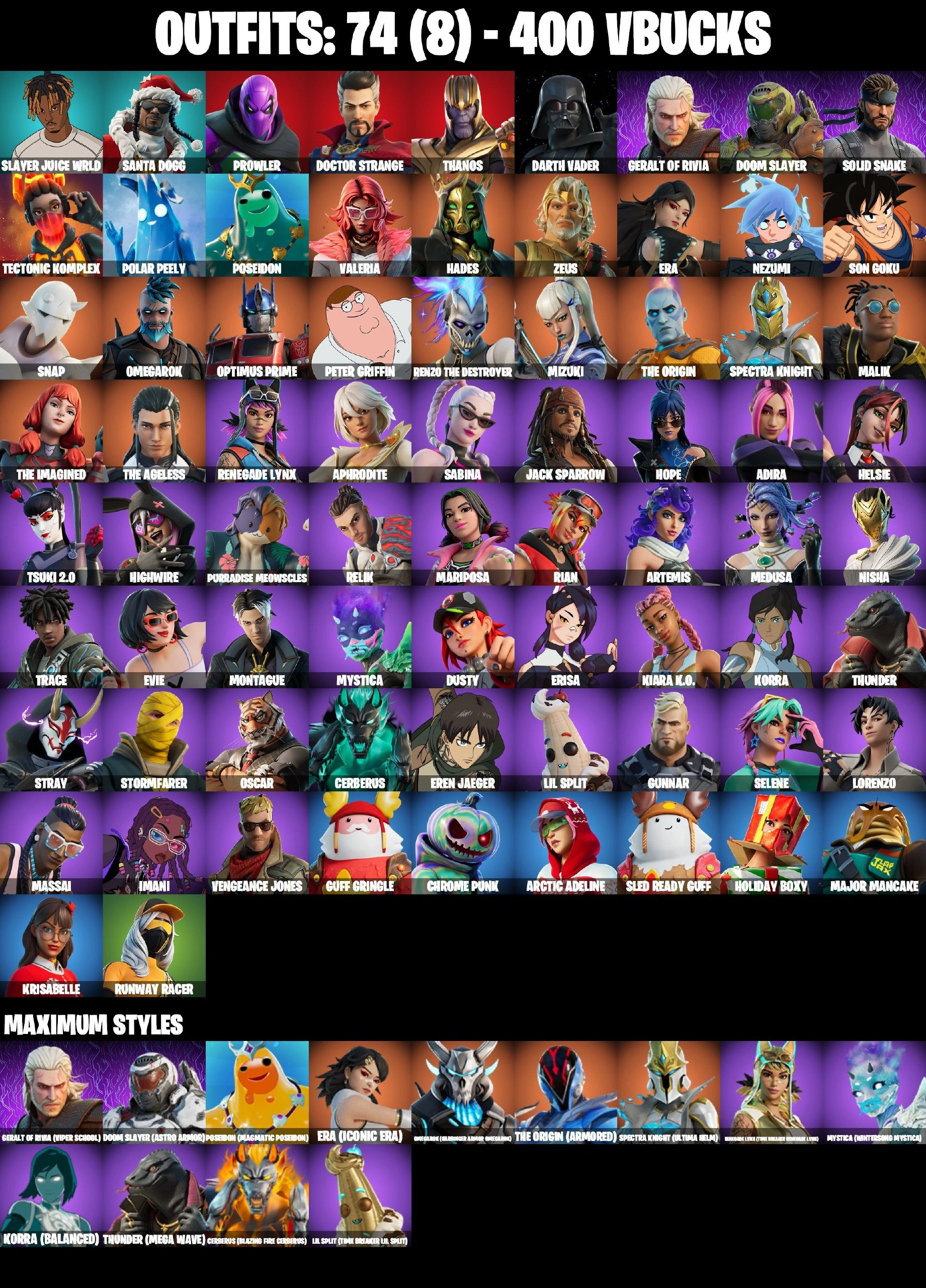 ❤️ 74 SKINS ❤️ DARTH VADER ❤️ GET GRIDDY ❤️ SON GOKU ❤️ EREN JAEGER ❤️ ERA MAX ❤️ MYSTICA MAX0 ❤️ HELSIE ❤️ MARIPOSA ❤️ ARTEMIS ❤️ EVIE ❤️ TSUKI 2.0 ❤️ CAN PLAY ON PSN ❤️ XBOX ❤️ PC ❤️ NINTENDO ❤️ MOBILE ❤️ 400 VBUCKS ❤️