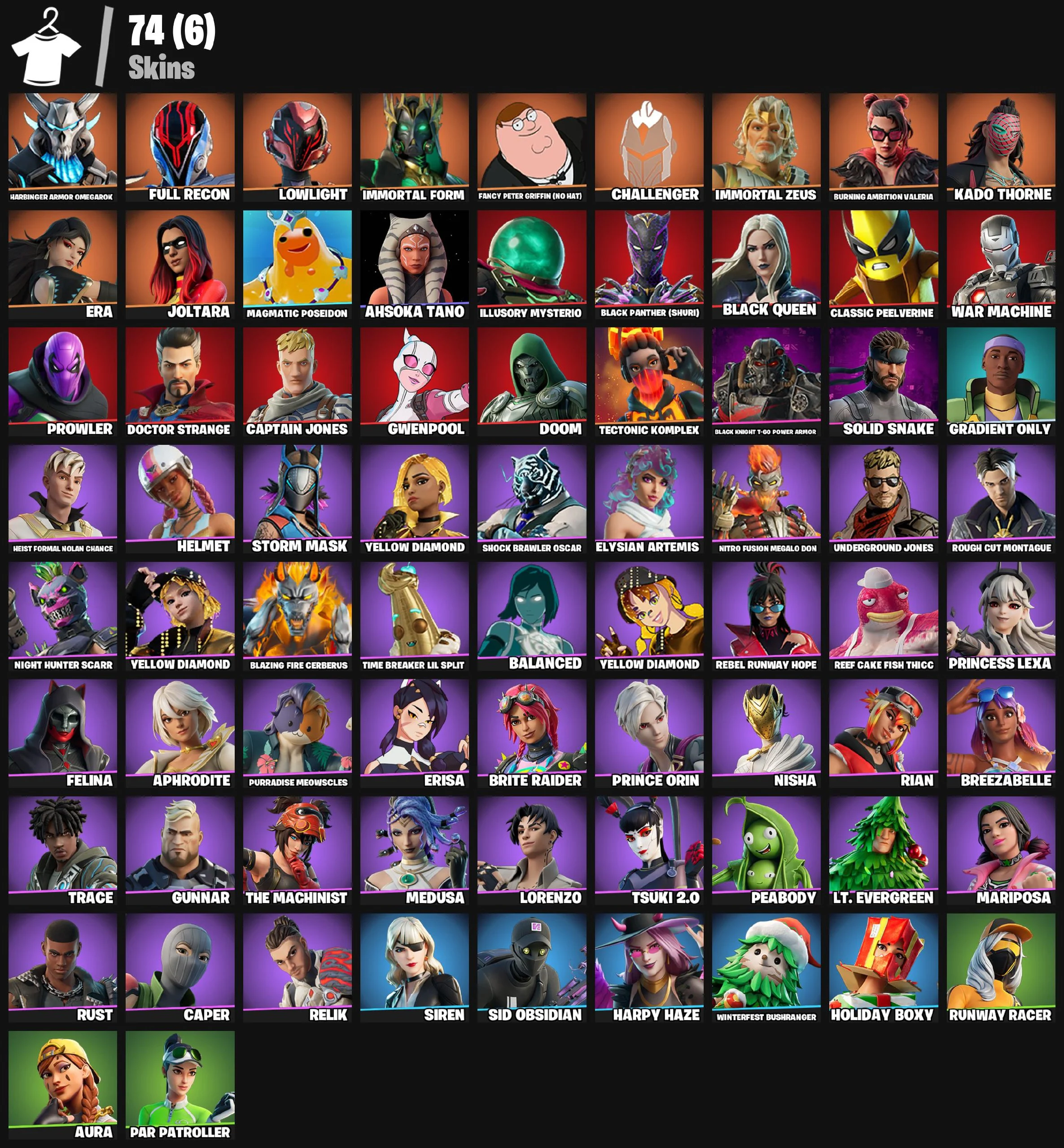 💜 [ 74 ] SKINS | HARBINGER ARMOR OMEGAROK | FULL RECON | LOWLIGHT | IMMORTAL FORM | FANCY PETER GRIFFIN (NO HAT) | CHALLENGER | IMMORTAL ZEUS | 150 VB