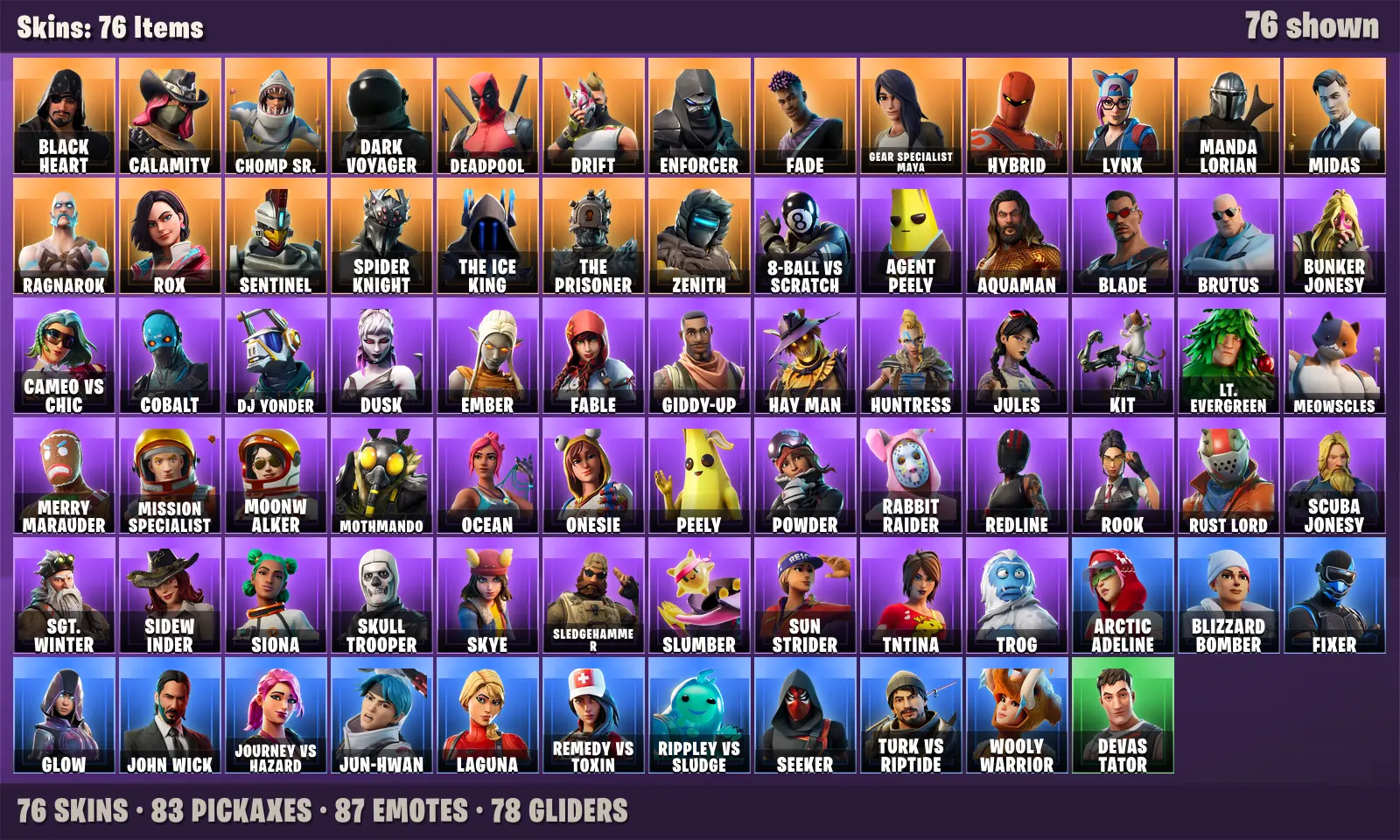 ⭐️ 76 Skins | Take The L + Glow + Fixer + Midas + Drift + Chomp Sr. + Spider Knight + Blackheart | 800 VB
