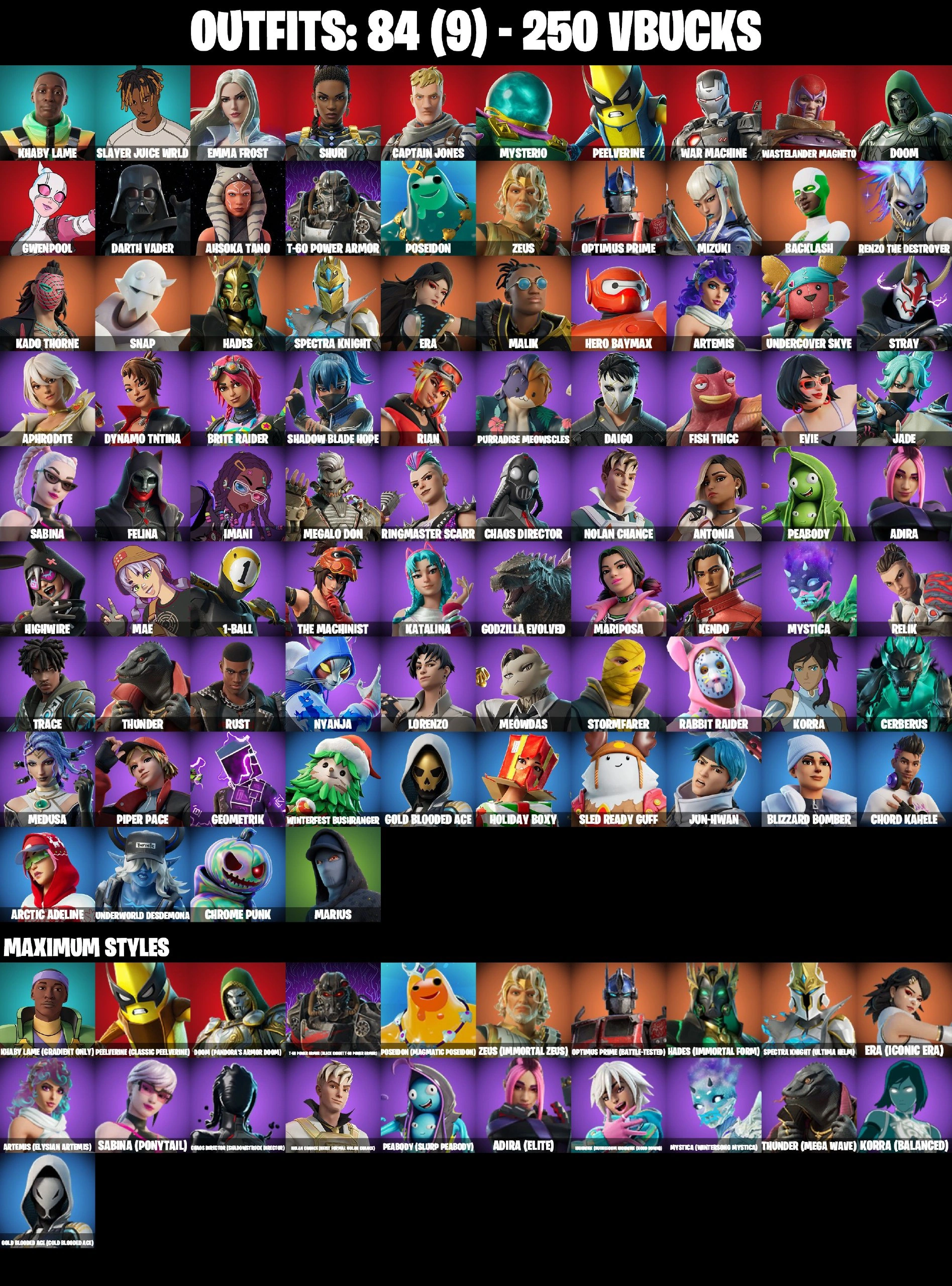 ❤️ 84 SKINS ❤️ BACKLASH ❤️ GET GRIDDY ❤️ DARTH VADER ❤️ AHSOKA TANO ❤️ ERA MAX ❤️ MYSTICA MAX ❤️ ARTEMIS MAX ❤️ EVIE ❤️ MARIPOSA ❤️ CHAOS DIRECTOR MAX ❤️ CAN PLAY ON PSN ❤️ XBOX ❤️ PC ❤️ NINTENDO ❤️ MOBILE ❤️ 250 VBUCKS