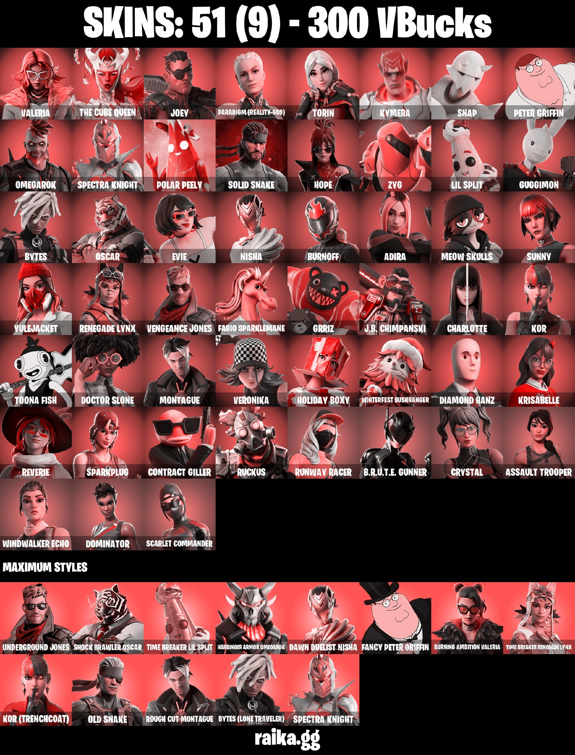 πβ¨LIMITED OFFERβ¨π 51 SKINS π VALERIA π THE CUBE QUEEN π JOEY π PARADIGM (REALITY-659) π TORIN π KYMERA π SNAP π PETER GRIFFIN π OMEGAROK π SPECTRA KNIGHT π POLAR PEELY π SOLID SNAKE π HOPE π ZYG π LIL SPLIT π 300 VBUCKS β‘οΈPC/PSN/XBOXβ‘οΈ