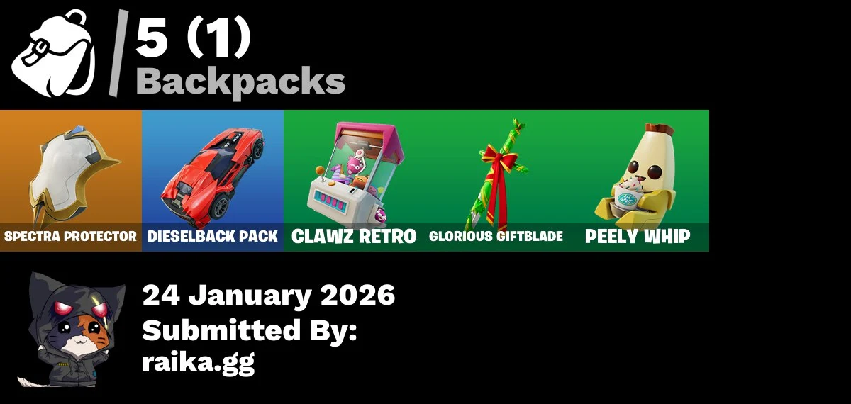 [PC] 1 skins | Holiday Boxy | Spectra Protector | Dieselback Pack | Clawz Retro | Glorious Giftblade | Peely Whip | Nanner Bashers | Secret Scimitars | 0 VB