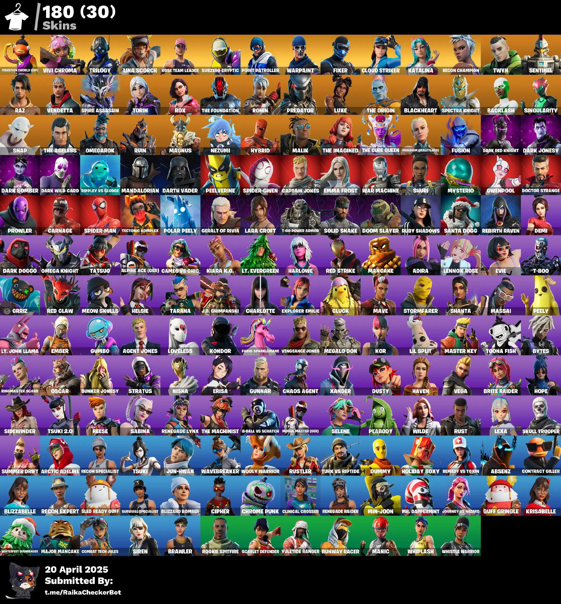 [PC] 180 skins | OG STW | Renegade Raider | Fishstick (World Cup) | Vivi Chroma | Lina Scorch | Subzero Cryptic | Point Patroller ⸱ ChicksXFN09