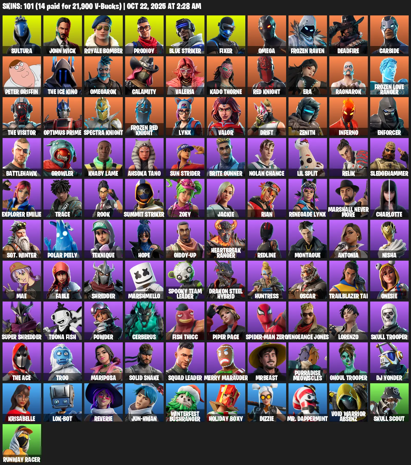 [PC/PSN/XBOX] | 101 skins | Omega | Sultura | John Wick | Royale Bomber | Prodigy | Blue Striker | Fixer | Frozen Raven | Deadfire | Carbide | S4G