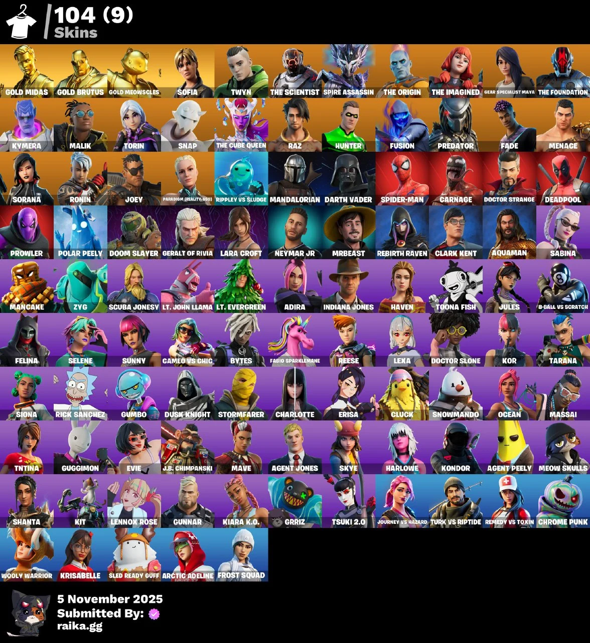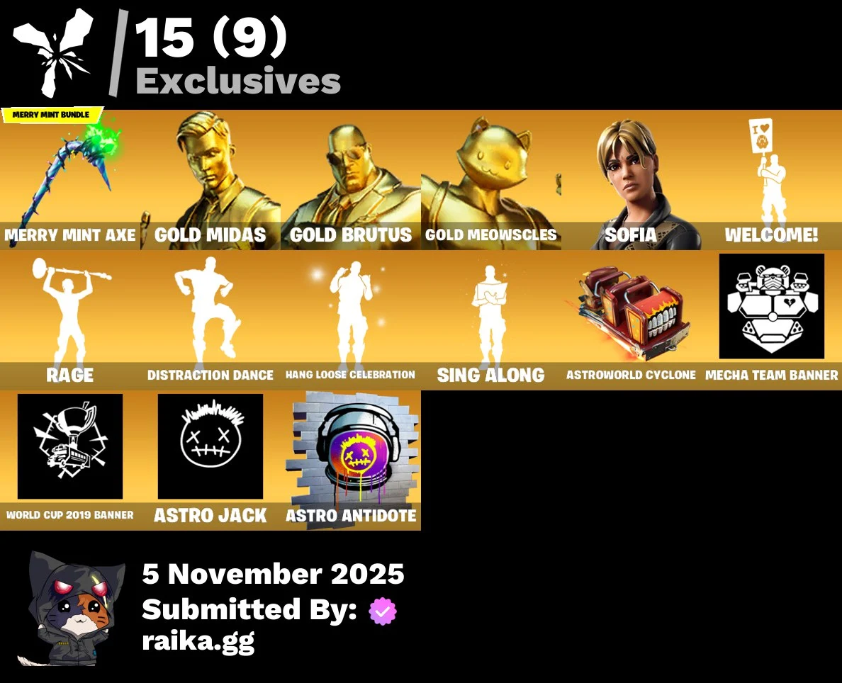 [PC/PSN/XBOX] 104 skins | Merry Mint Axe | Gold Midas | Gold Brutus | Gold Meowscles | Sofia | Twyn | The Scientist | Spire Assassin | The Origin | The Imagined | 950 VB