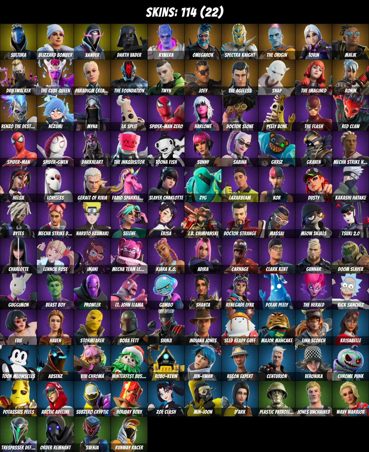 ⚡PC/PSN/XBOX⚡ 114 skins 💎 Naruto Uzumaki 💎 Rick Sanchez 💎 Kor 💎 Spider-Gwen 💎 Darth Vader 💎 Spider-Man 💎 The Ageless 💎 Kakashi Hatake 💎 Renzo the Destroyer 💎 Toona Fish 💎 Recon Expert 💎 Snap 💎 Doctor Strange 💎 Boba Fett 💎 Sultura 💎 0 V-Bucks 💎
