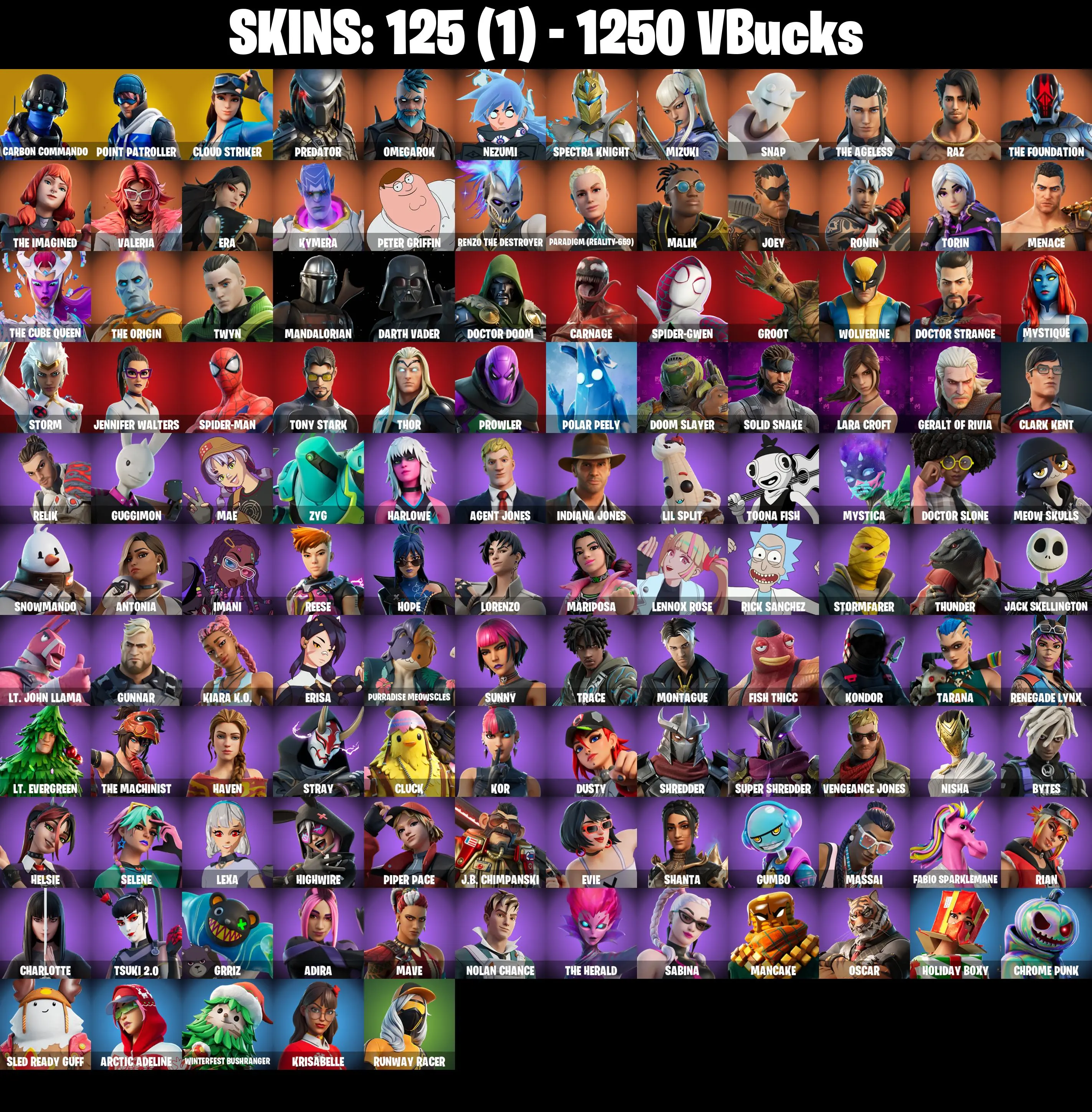 PC/PSN/XBOX ♨️125 skins ✨ Lara Croft ✨ Spider-Gwen ✨ Spider-Man ✨ Tony Stark ✨ Menace ✨ Rick Sanchez ✨ Carnage ✨ Doctor Strange ✨ Darth Vader ✨ #B810