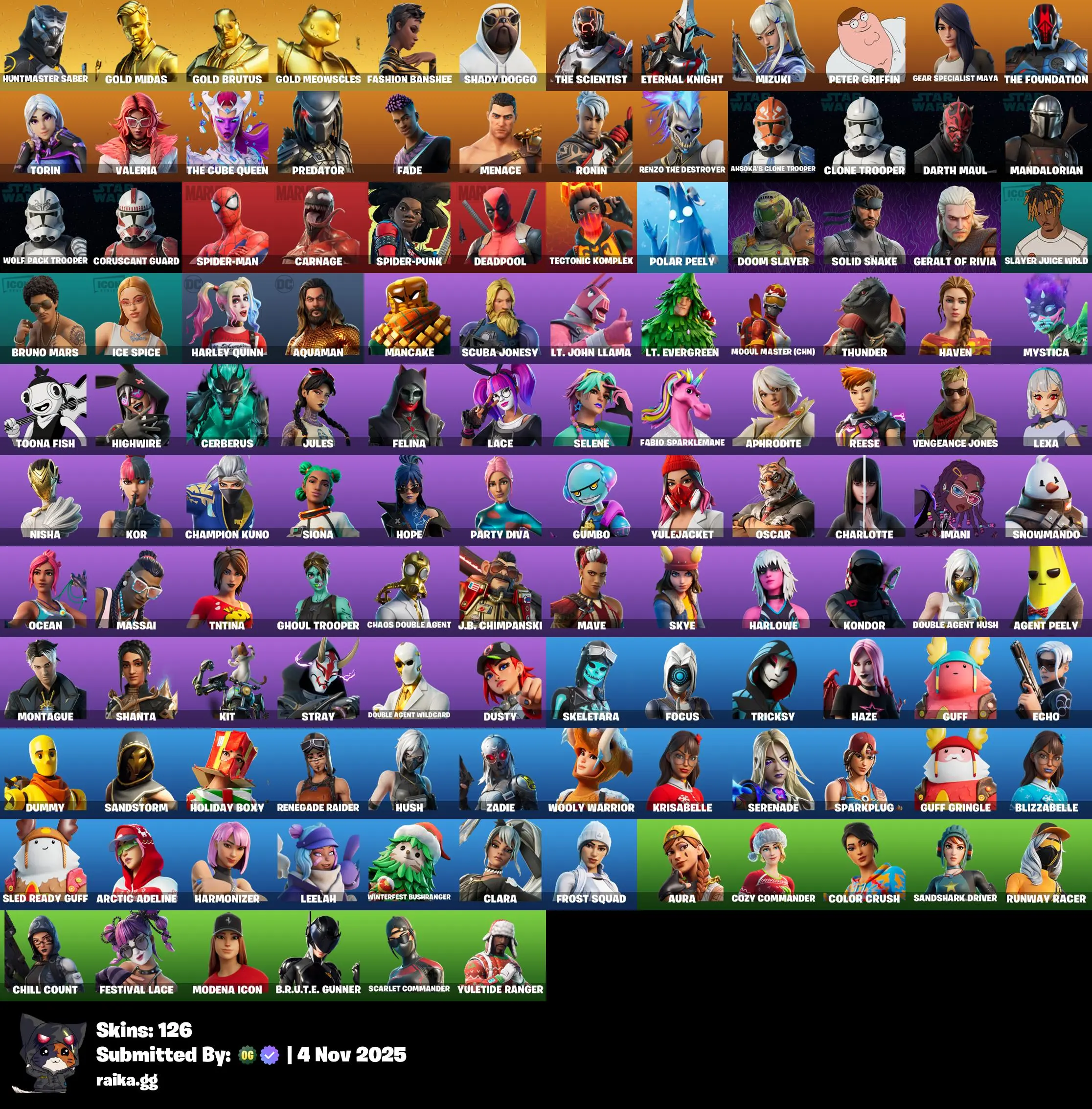 [PC/PSN/XBOX] 126 skins | Renegade Raider | Huntmaster Saber | Gold Midas | Gold Brutus | Gold Meowscles | Fashion Banshee | Shady Doggo | The Scientist | 400 VB