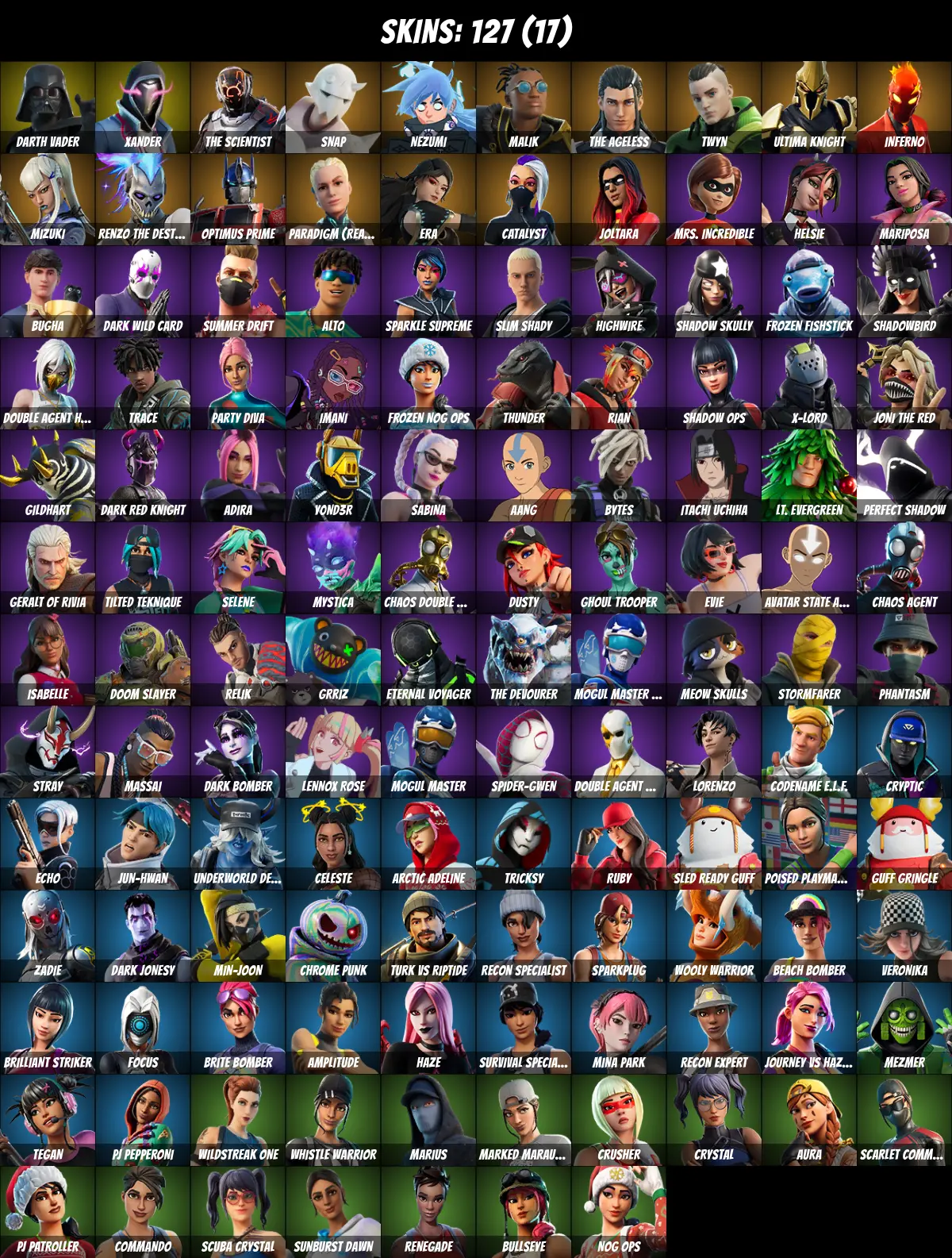 ⚡PC/PSN/XBOX⚡ 127 skins 💎 Ghoul Trooper 💎 Candy Axe 💎 Joltara 💎 Spider-Gwen 💎 Darth Vader 💎 Aura 💎 Focus 💎 The Ageless 💎 Itachi Uchiha 💎 Catalyst 💎 Ultima Knight 💎 Renzo the Destroyer 💎 Crystal 💎 Recon Expert 💎 Snap 💎 Xander 💎 800 V-Bucks 💎