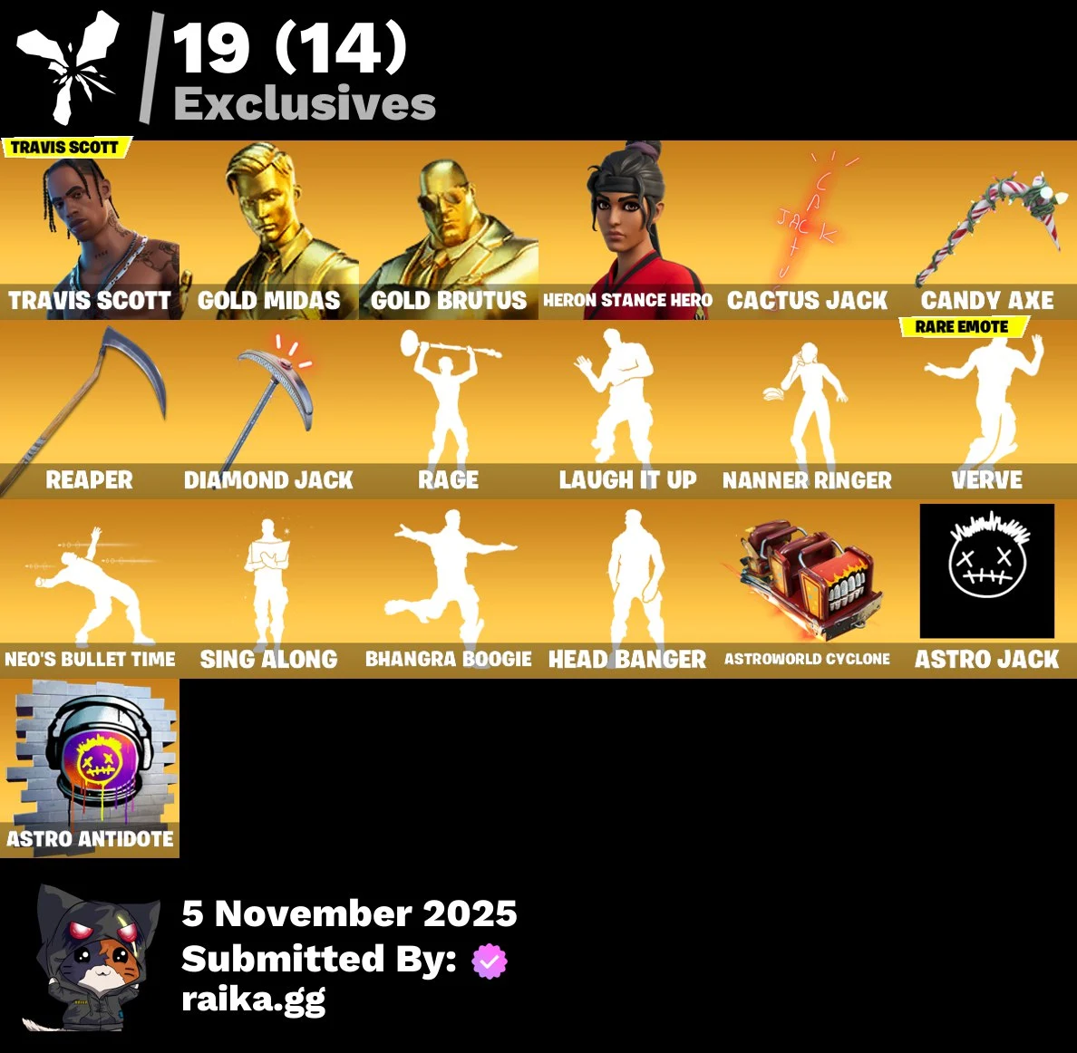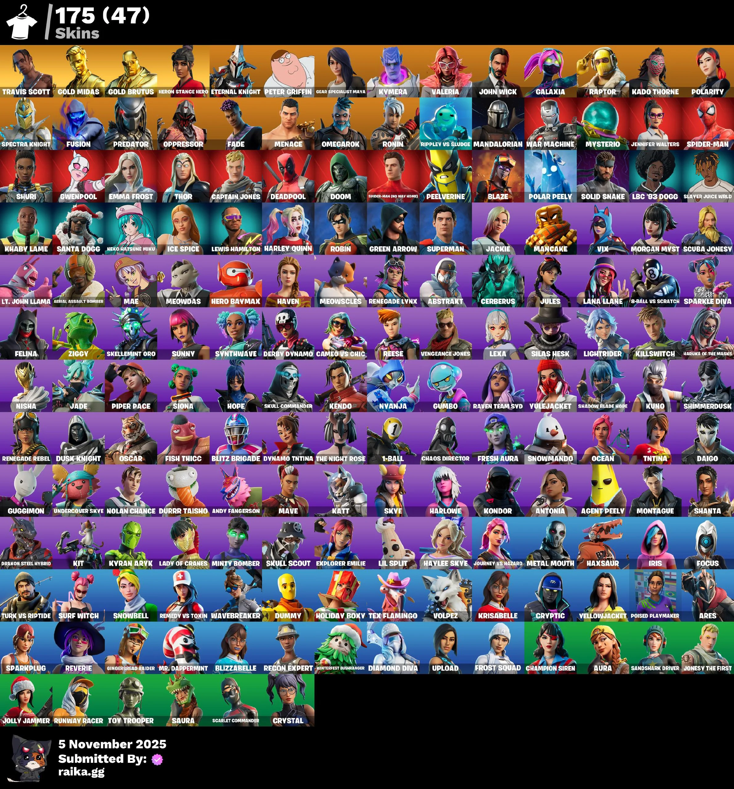 [PC/PSN/XBOX] 175 skins | Travis Scott | Gold Midas | Gold Brutus | Heron Stance Hero | Eternal Knight | Peter Griffin | Gear Specialist Maya | Kymera | Valeria | 2250 VB