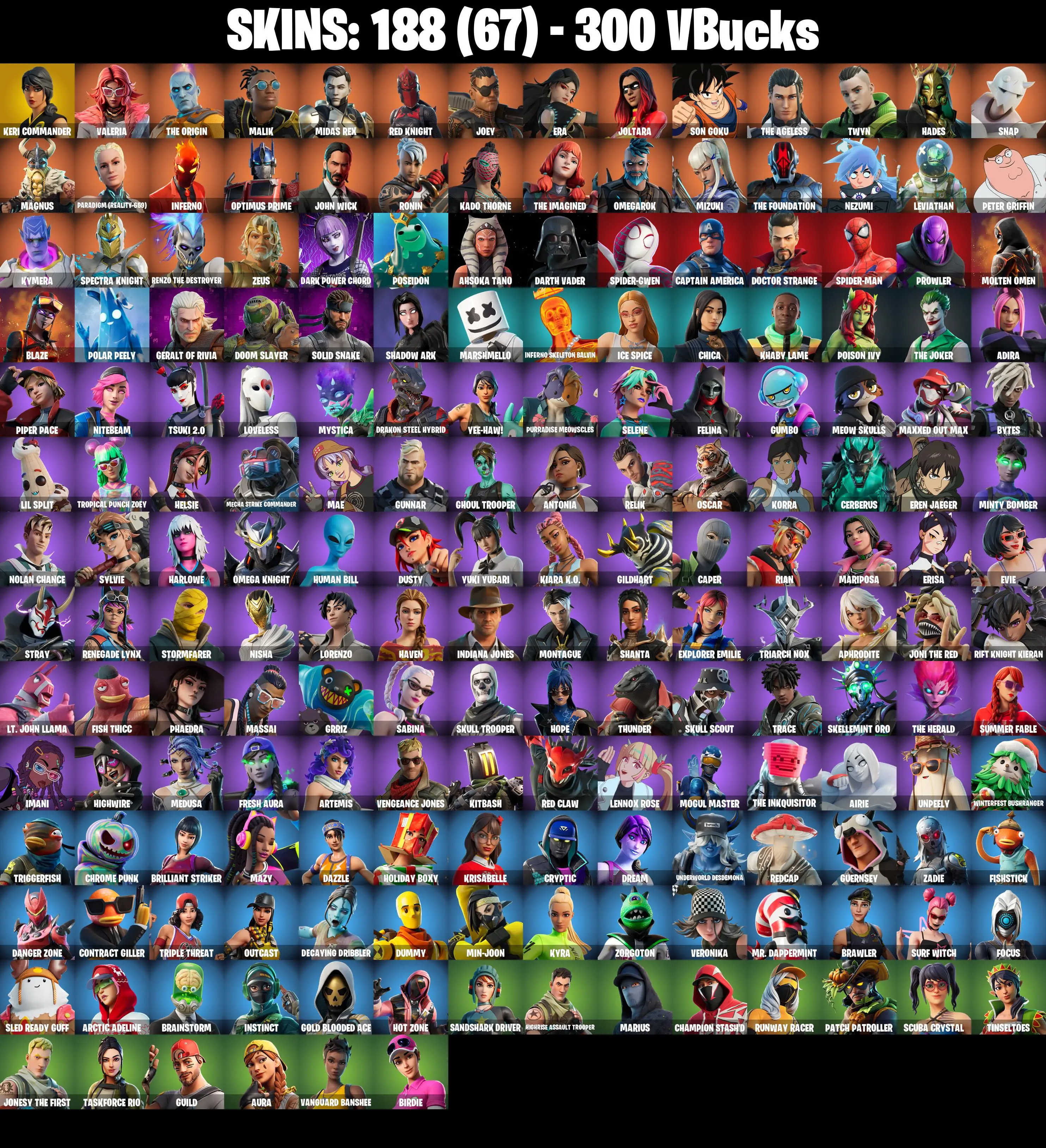 (PC/PSN/XBOX) 188 SKINS 🎰 Keri Commander 🎰 Valeria 🎰 The Origin 🎰 Malik 🎰 Midas Rex 🎰 Red Knight 🎰 Joey 🎰 Era 🎰 Joltara 🎰 Son Goku 🎰 The Ageless 🎰 300 V-Bucks PARENTAL CONTROL